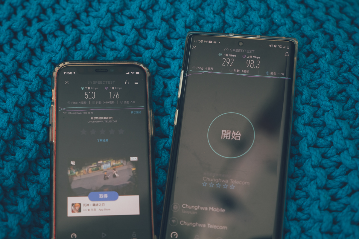 - Galaxy Note 10:下載/292Mbps、上傳/98.3Mbps