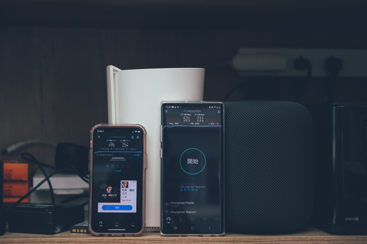 首先,阿湯家裡的網路速度是 500Mbps/250Mbps,我們就先在書房放置主要 Deco X90 的位置測一下連線速度,為了避免手機不同系統或型號影響速度測試結果,分別用了 iPhone 12 mini 以及 Samsung Galaxy Note10 進行測試,測試的過程也都是單一台進行測速,沒有同時進行,避免互相影響結果,所以算是蠻準確的,往下就來分享測速結果。