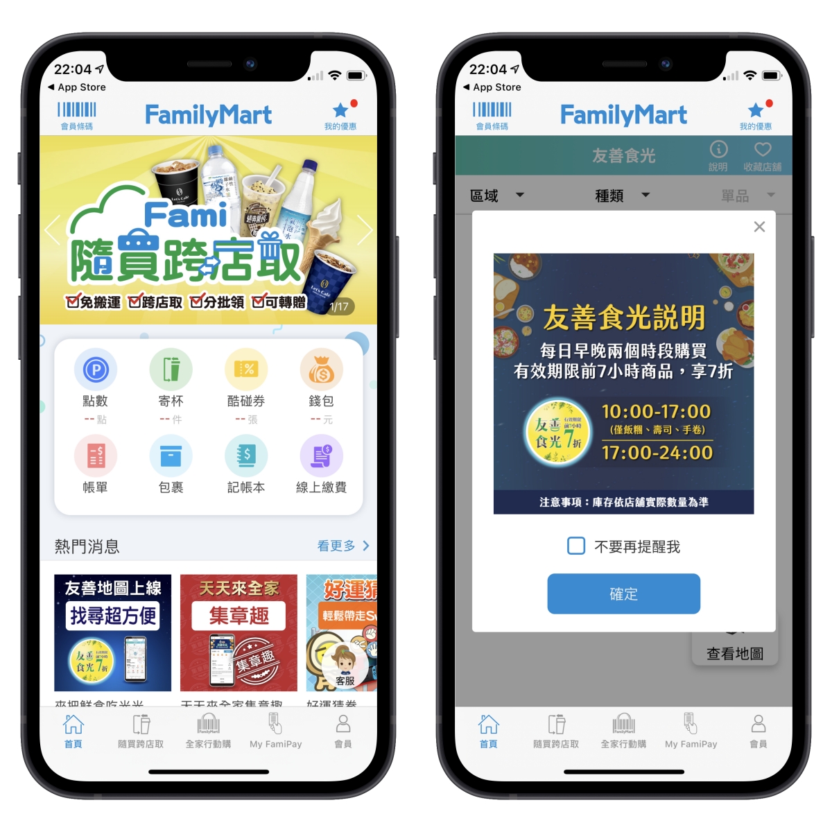 安裝好全家的 APP 後,在首頁就可以找到「友善食光地圖」,目前只有在首頁可以看到,不知道之後會不會獨立在哪一區,主要針對二個時段開放購買,在有效期限到達前 7 小時的商品通通都是七折,分別是早上 10:00~17:00 以及 17:00~24:00,基本上除了半夜跟一大早之外,全天都可以買的到。