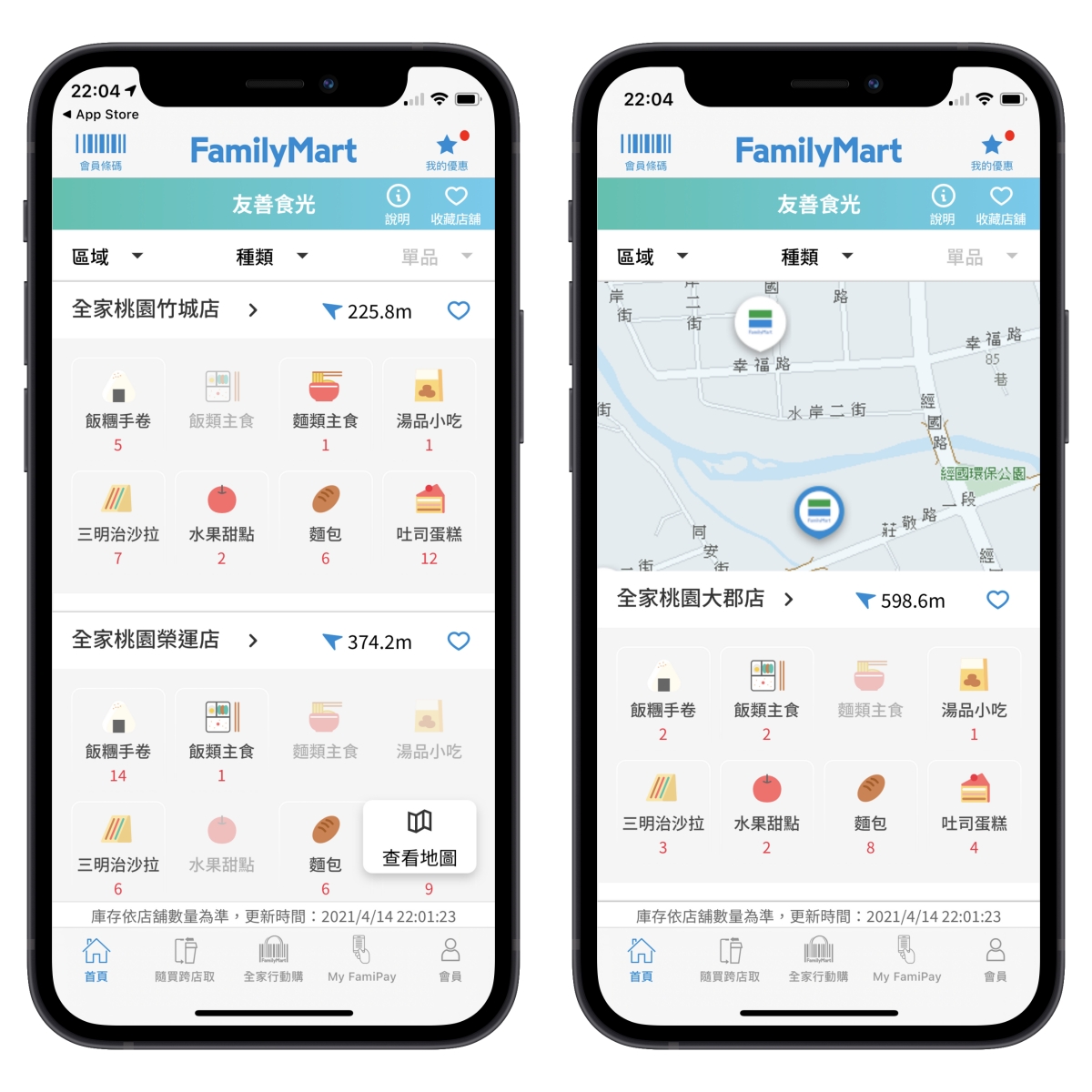 進入後,友善食光可以用列表的方式或地圖查看的方式找到附近的全家有哪些,而每間還剩下哪些東西。