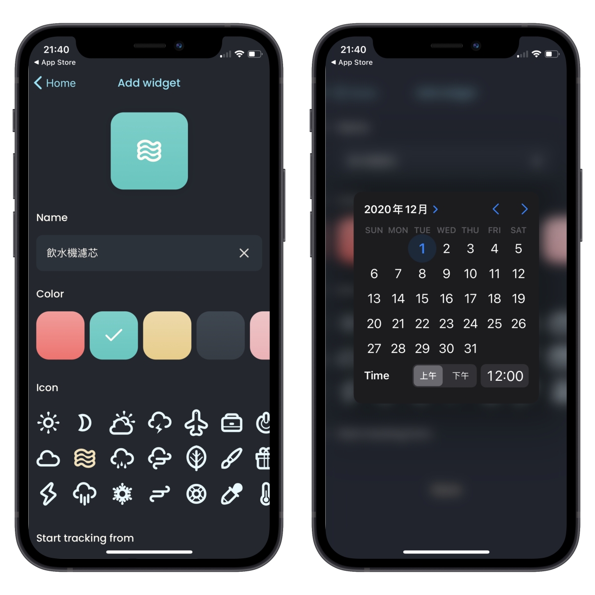 雖然是英文介面,但認真來說使用上完全沒有語言的問題,直接輸入記錄的項目,選擇代表色、圖示以及這次處理的時間,就可以儲存了。