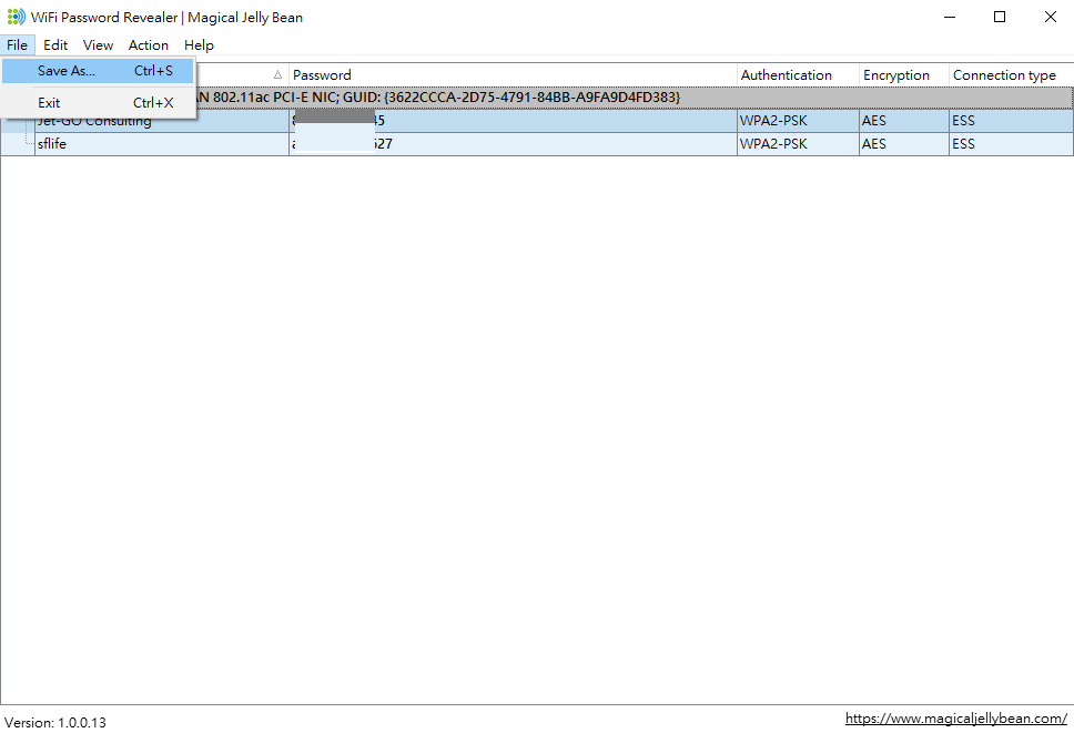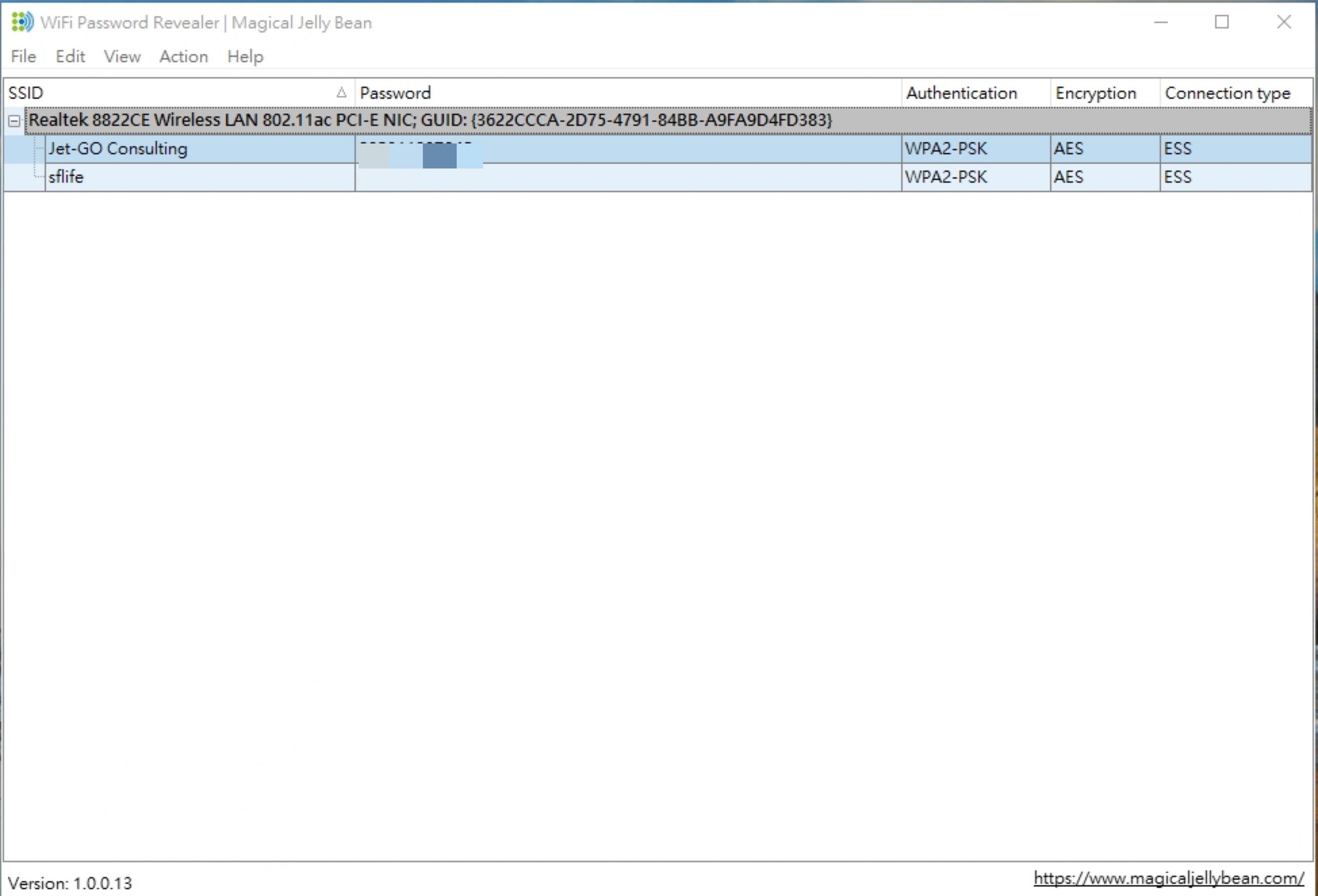 WiFi Password Revealer 下載:https://www.magicaljellybean.com/wifi-password-revealer/下載並安裝好軟體後,直接開啟就會將掃描到的 WiFi 連線資訊通通顯示出來,包括 SSID、密碼、驗證方式以及加密方式等。