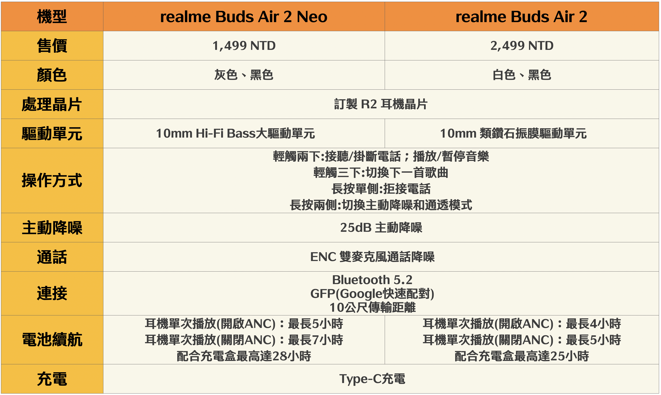 這次 realme 同步推出二款分別是「realme Buds Air 2」及「realme Buds Air 2 Neo」,二者的設計完全不同,而規格上的最大差別主要是音質及續航能力,往下先來看一下規格差異表。