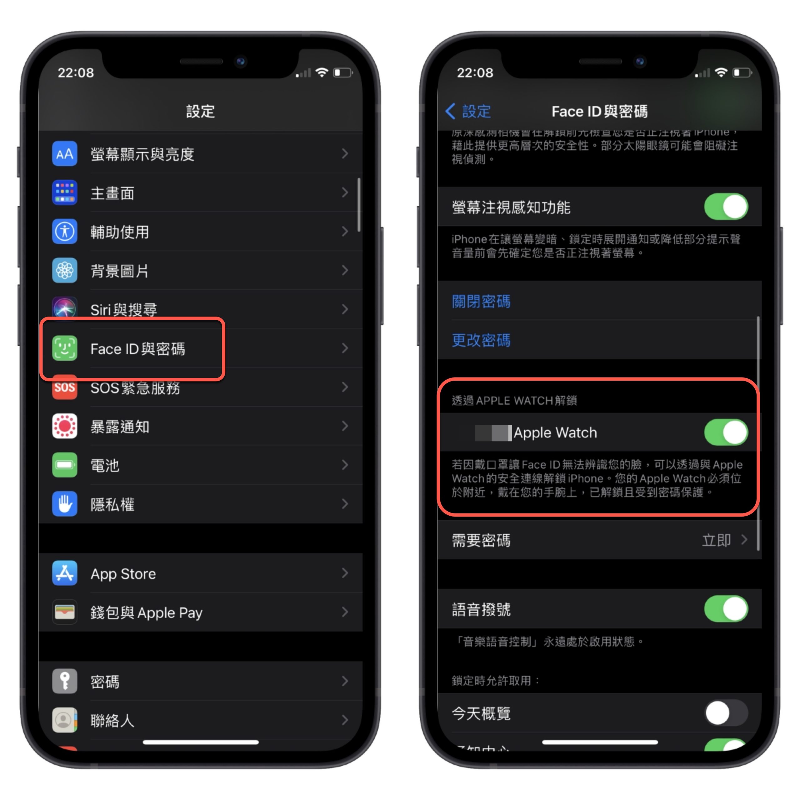 確認你的 iPhone 跟 APPLE Watch 都升級到對應的版本以上後,就可以進到 iPhone 的設定 > Face ID 與密碼,這邊往下就會看到多了一個「透過 APPLE Watch 解鎖」的新功能了,這時要先戴著 APPLE Watch,並且確認解鎖 APPLE Watch 後就可以開啟該選項。