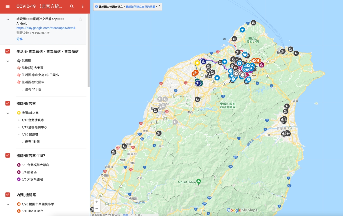 網友自製 COVID-19 確診者足跡地圖(非官方統整)