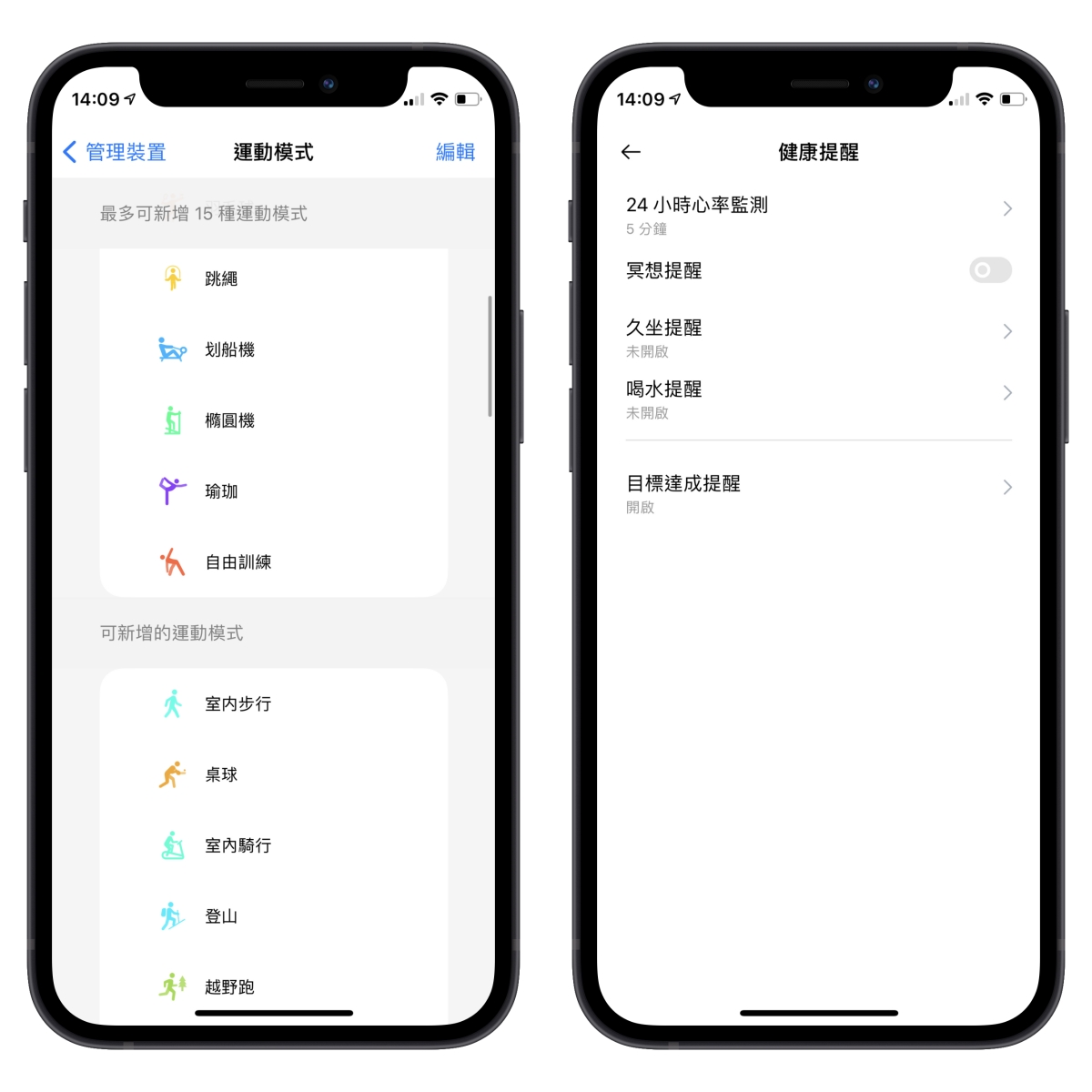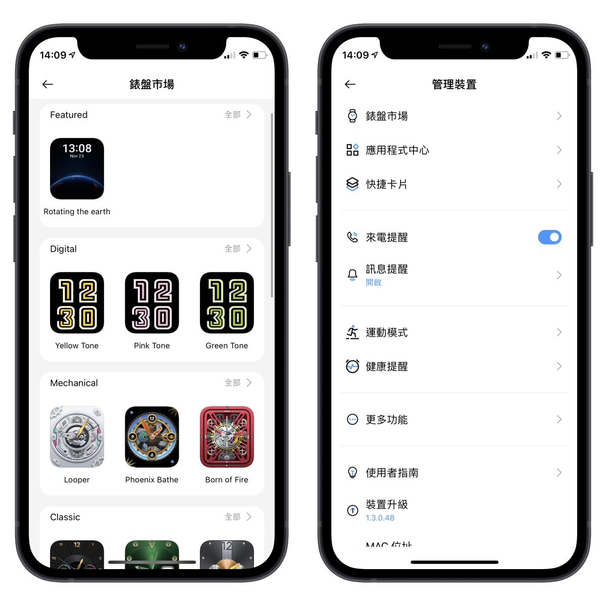 透過錶盤市場可以再加入更多樣式的錶面,而管理裝置的設定裡也有更多實用的設定,像是來電提醒、訊息提醒、健康提醒。