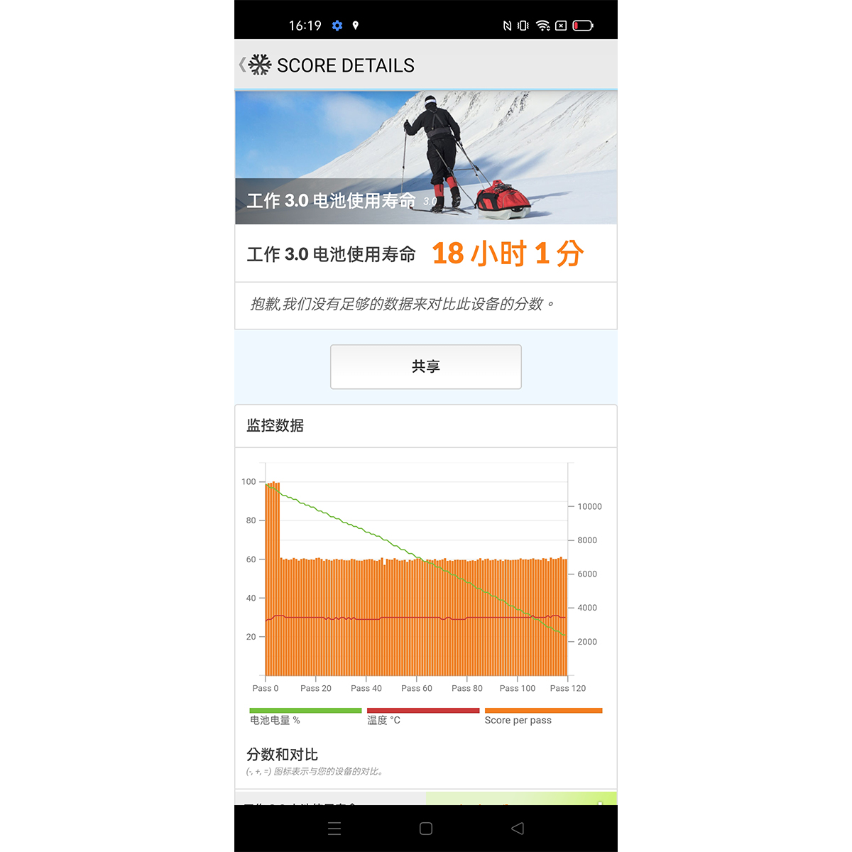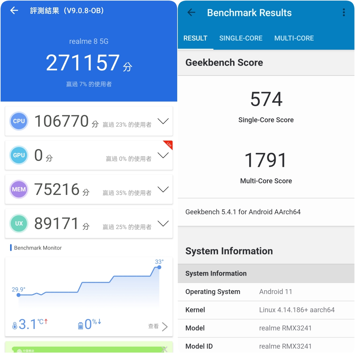 續航透過 PCMARK 測試下,獲得了 18 小時 1 分鐘的亮眼成績,這不僅是搭載 5000mAh 大電量電池的結果,續航也受到處理器及系統的調校所影響,整體而言 realme 在系統的使用調校上一直都是維持相當不錯的品質。