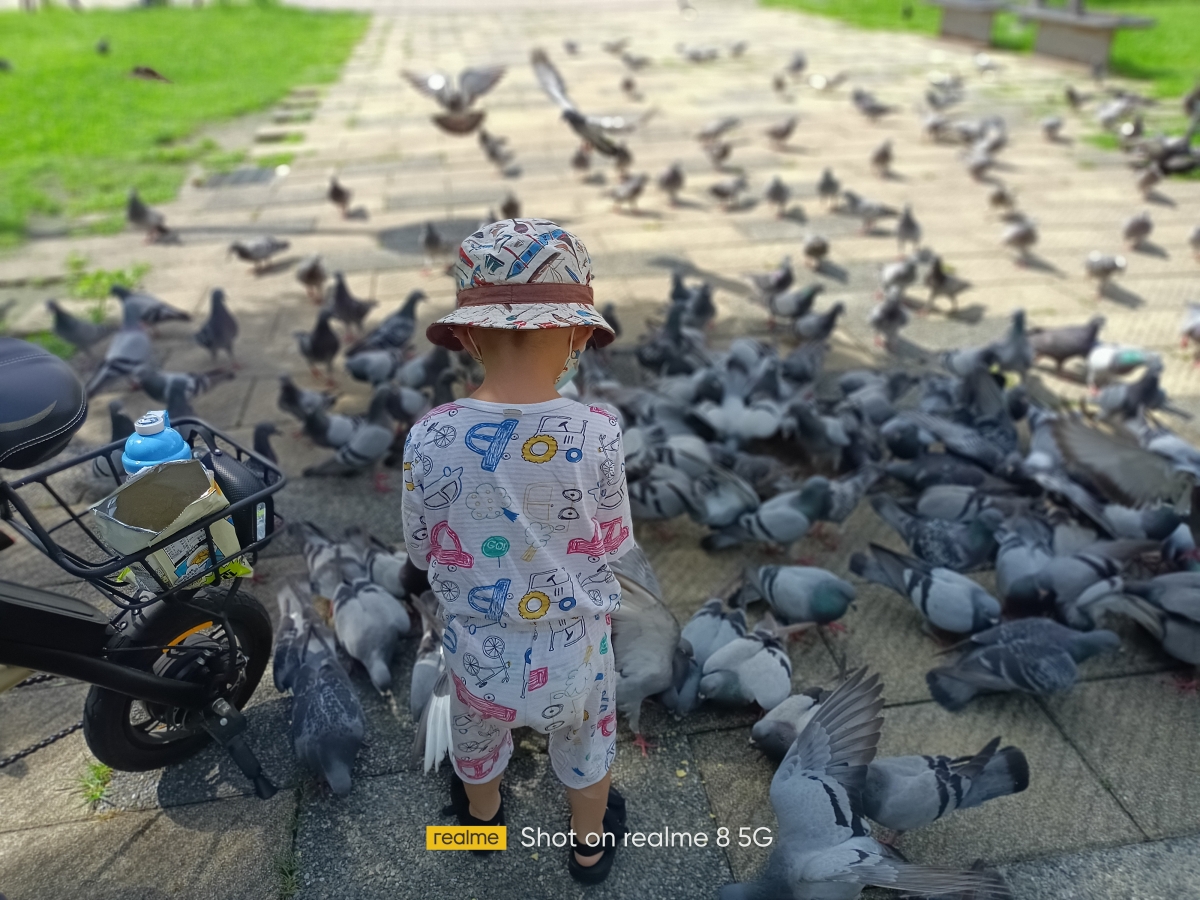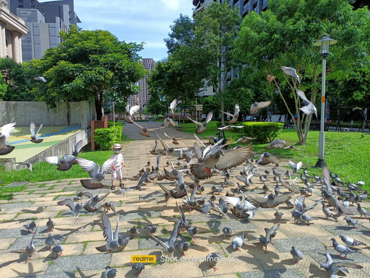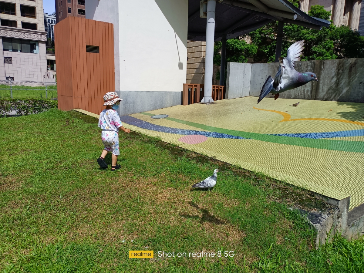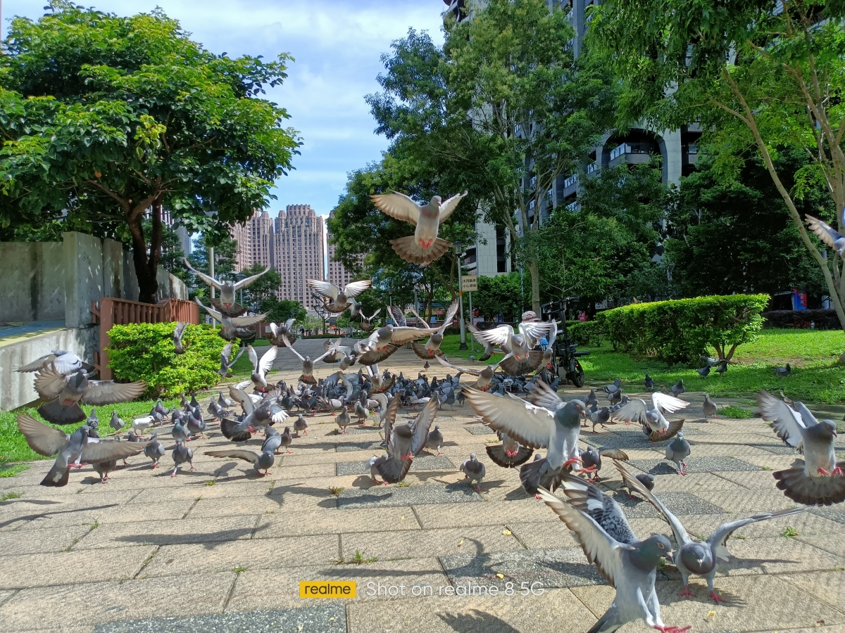 阿湯也實際帶著 realme 8 5G 外出去拍照給大家參考,原本下了很久的雨,我一看到出太陽就立刻出門,還順便帶湯包去餵鴿子,幾年前的平價手機真的就是平價手機,即便在大陽光仍然無法捕捉動作太快的畫面,而現在 realme 8 5G 雖然是平價的手機,但你可以看到就算是鴿子飛翔的瞬間一樣可以像靜止般拍攝下來,大家就知道現在即便是平價手機,拍照還是可以有相當的水平。