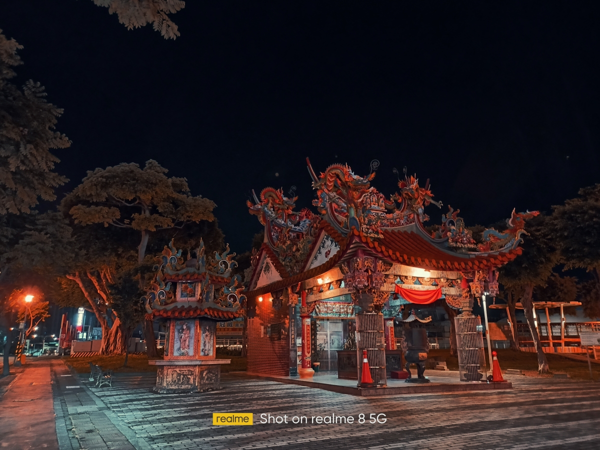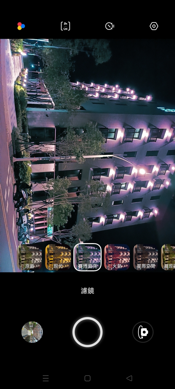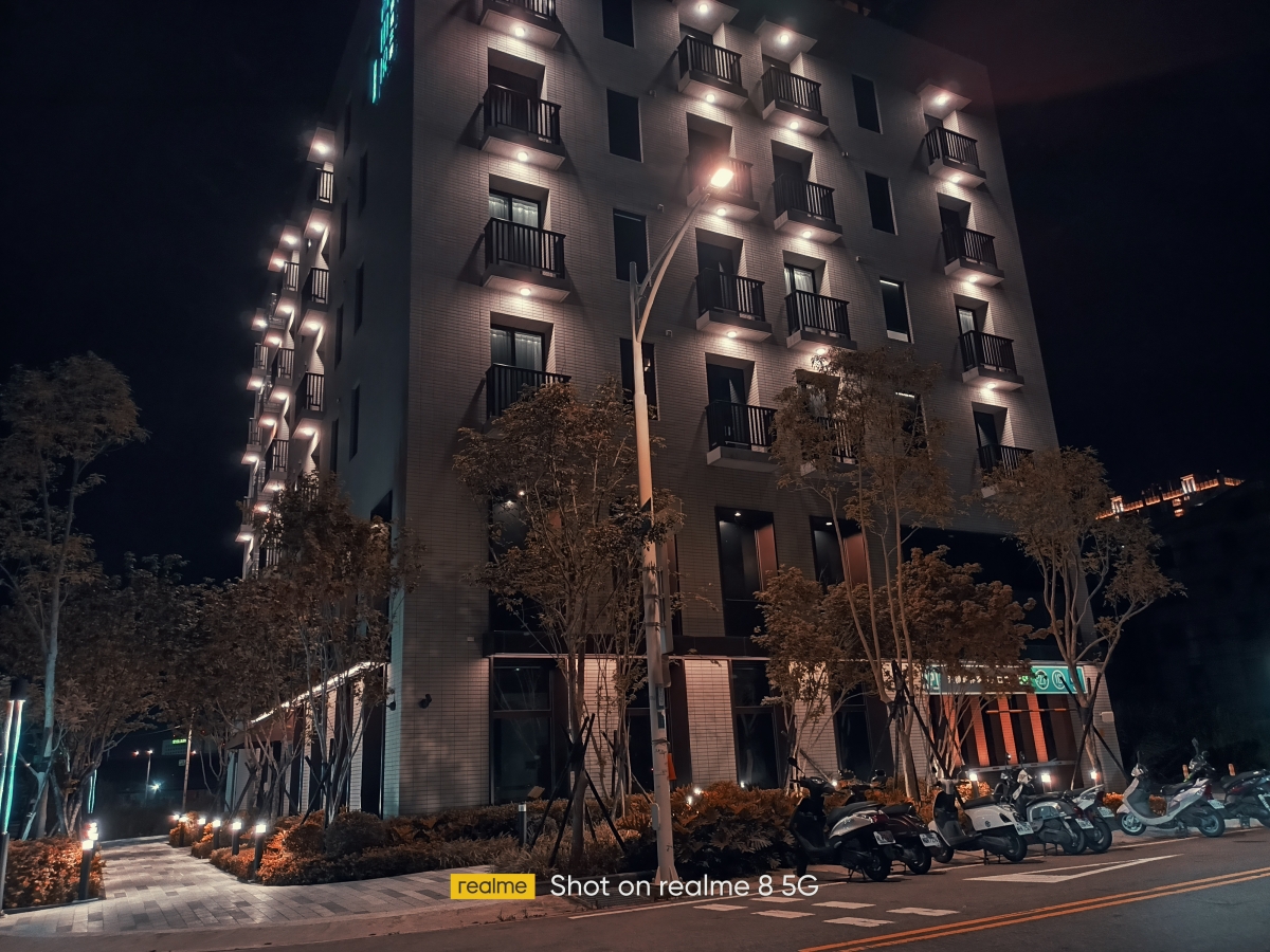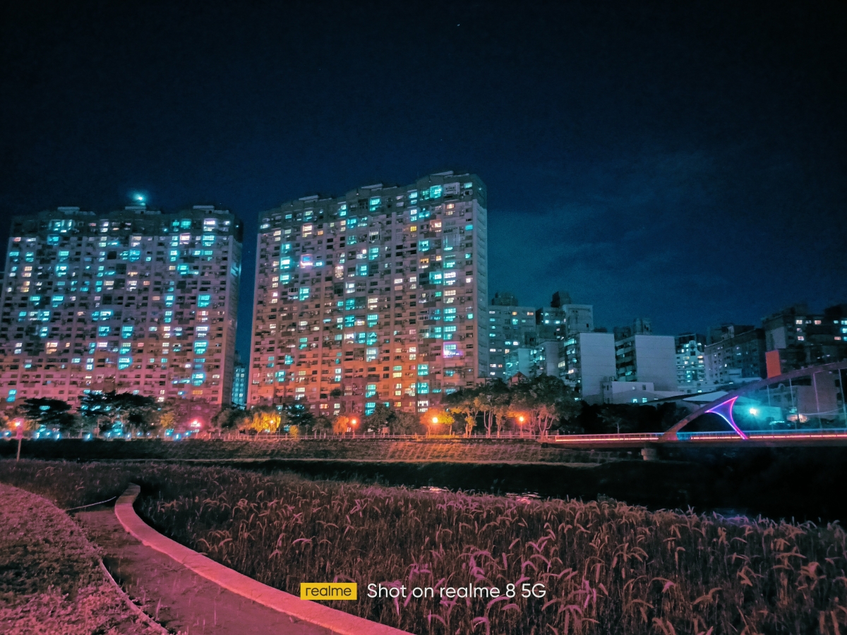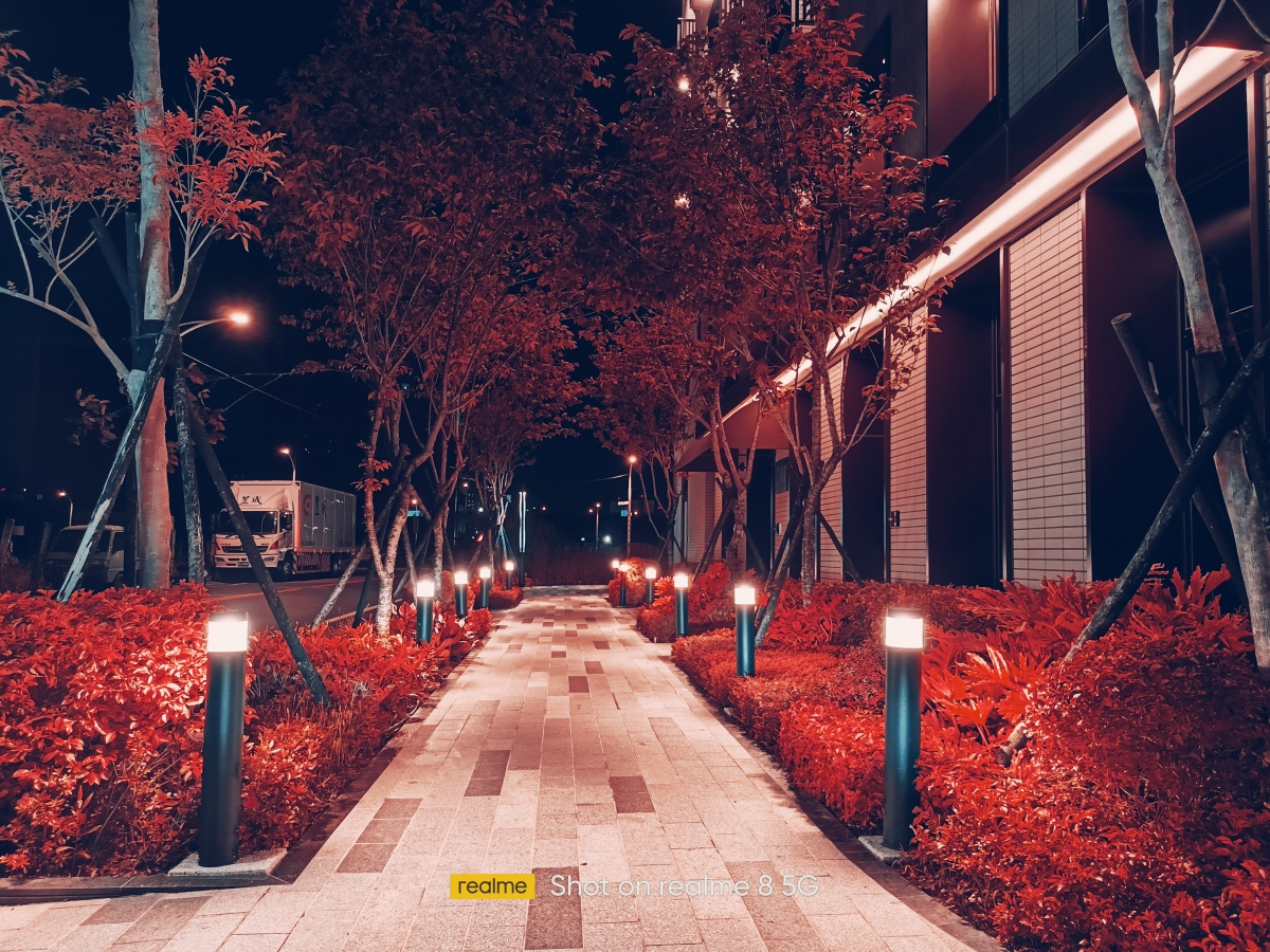 夜間拍照的部份,除了透過夜景模式拍攝可以讓畫面更加銳利之外,這次 realme 8 5G 上也加入了夜景濾鏡,透過這些濾鏡的套用,可以讓夜景看起來更加璀璨奪目。