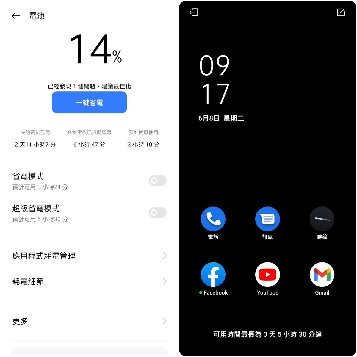 realme 8 5G 除了基本續航很強之外,即便你電量真的用到剩下 5~10% 也不用擔心,只要開了超級省電模式,還可以讓你以最低功耗的方式再戰幾個小時都沒問題,實際開啟後,會切換到簡易的畫面,畫面上除了基本的電話、簡訊跟時鐘外,可以額外自行選擇三個必要的 APP 來使用,讓你徹底的善用最後剩餘的電量。