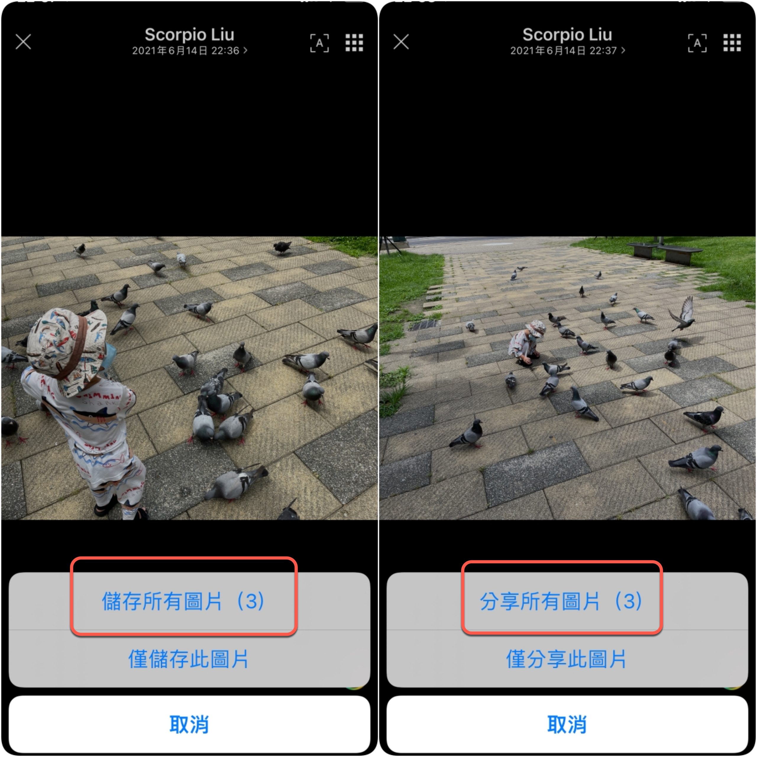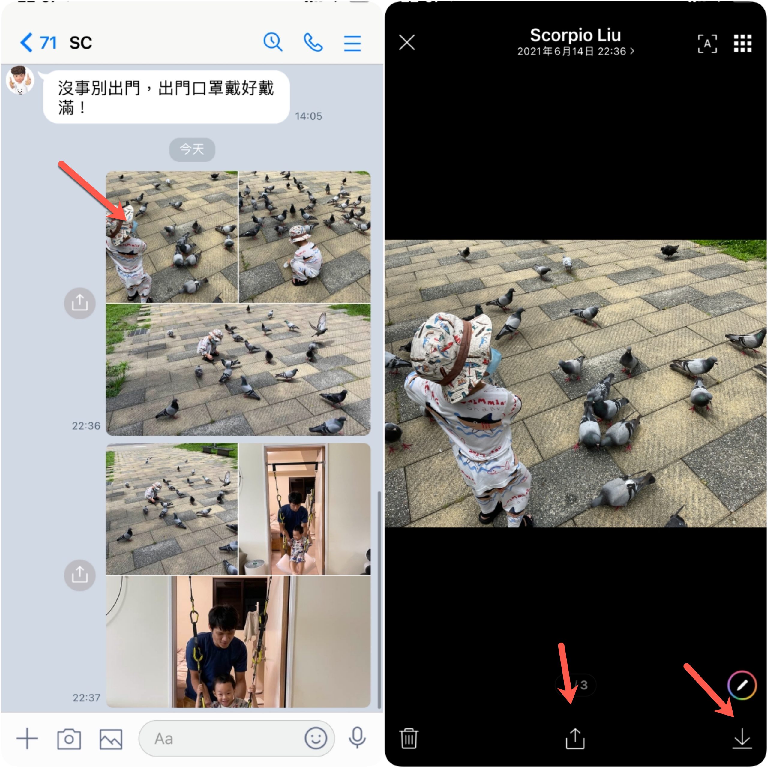 就像這種單一訊息裡有多張照片傳來的,這種以前都只能一張一張下載,現在可以一次全部下載,你一樣先隨便點一張照片進去,然後右下角可以進入下載照片,中間下方的是分享照片,不論哪一種現在都可以一次全部搞定。註:iOS 需更新至 11.9.0 之後,Android 為 11.9.1