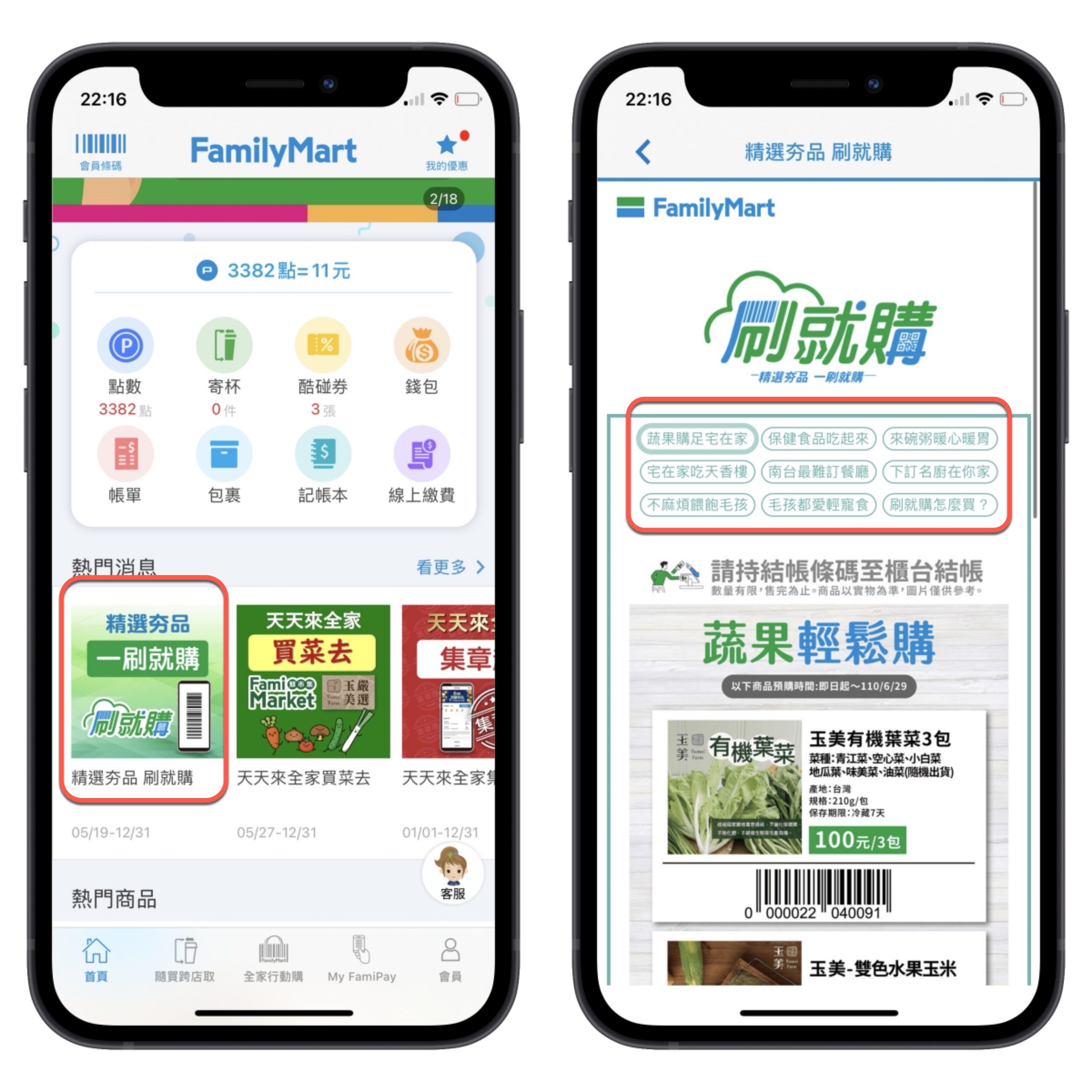 先去下載全家的 APP,然後進入後往下拉一點點就可以看到「刷就購」這個功能,進入後上方會有各種分類,而大家最需要的蔬果就在第一個。