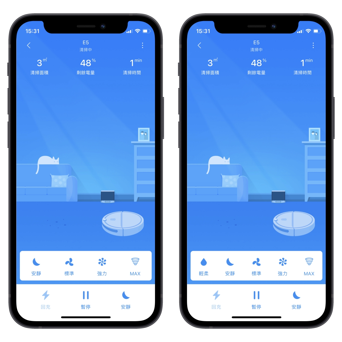 清潔模式主要有安靜、標準、強力、Max,但如果你想要再更安靜也可以在機器人裡設定開啟「輕柔模式」,這樣在選擇吸力時會多一個輕柔可以選擇,不過這模式下是以拖地為主,建議是搭配拖布支架啟用。