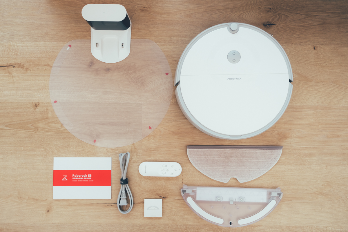先來說說盒裝內有哪些東西,分別包括 Roborock 石頭掃地機器人 E5 主機、充電座、電源線、防潮墊、說明書、遙控器、拖布及支架。
