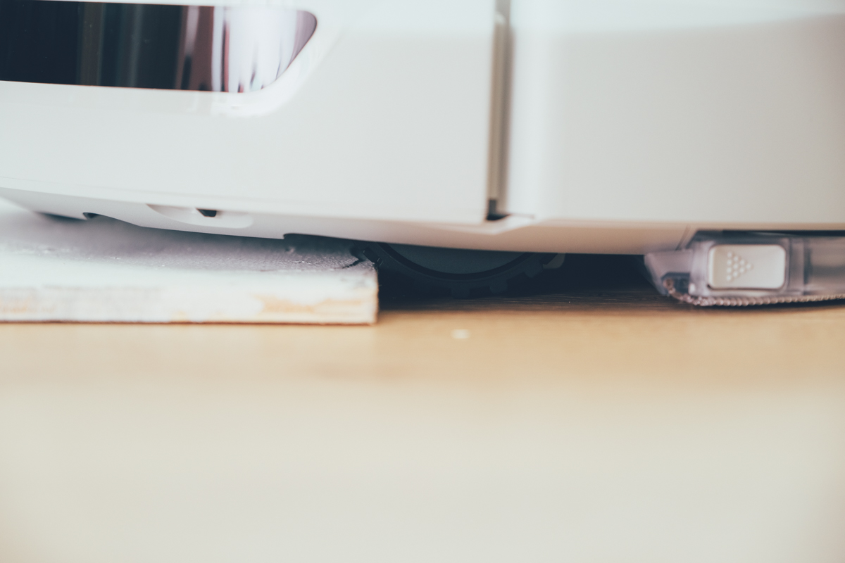 底部的大輪距能夠輕鬆的越過 2cm 高度(使用拖布支架時約 1.5cm)的地面,所以像門縫之間飾條,或者像地毯等,同樣都可以無所阻擋的上去清掃。