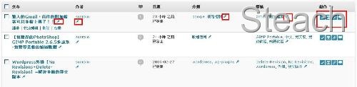 在後台點擊《文章→編輯》,就會發現在原本的各項目中,多了一個小鉛筆圖示,以及最右邊多了4個小圖示,沒錯,這就是快速編緝文章屬性的功能,看到這些圖示相信你已經大概了解功用了吧!!