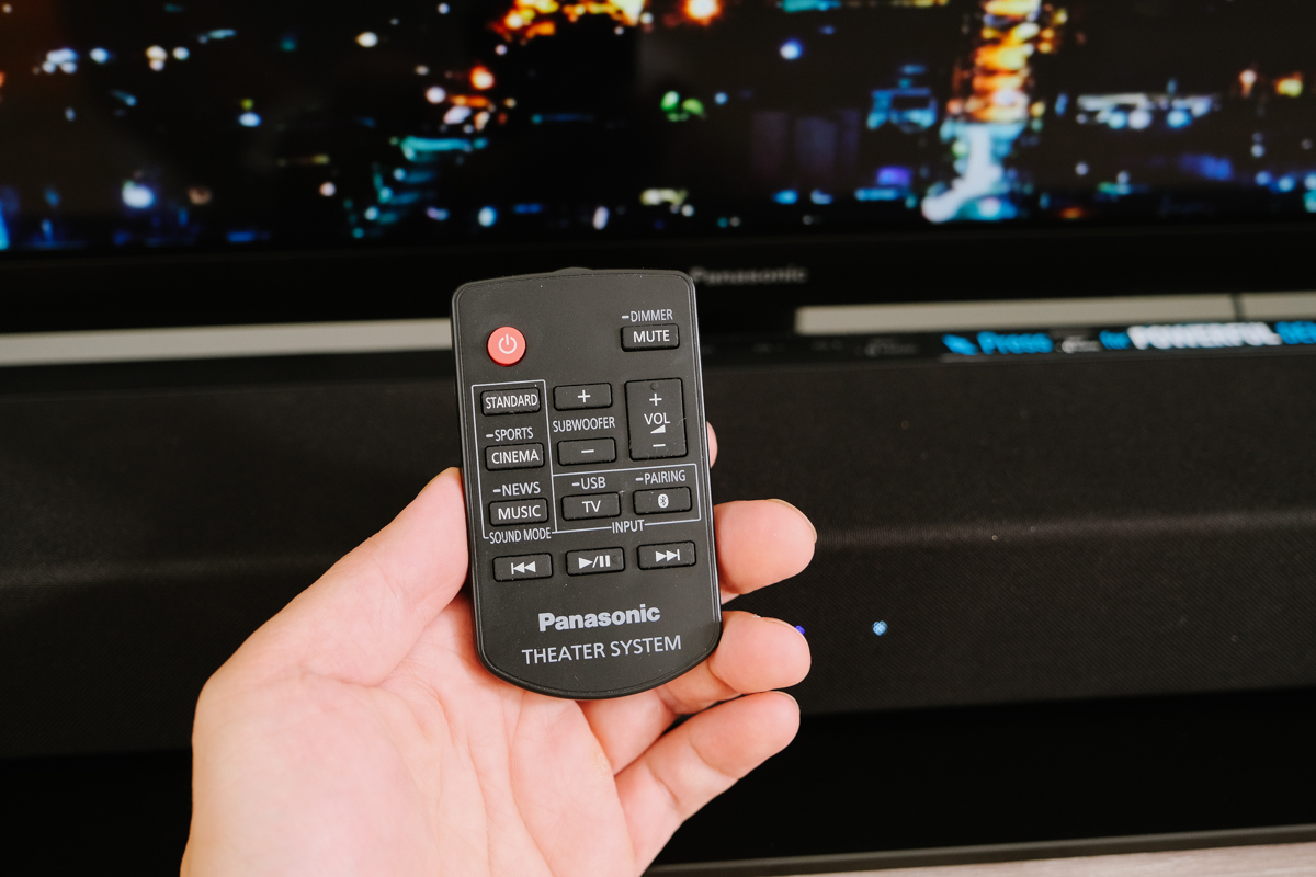 Sound Bar SC-HTB490 附有遙控器,可以在這裡切換音場模式以及基本的音量、播放等操作。