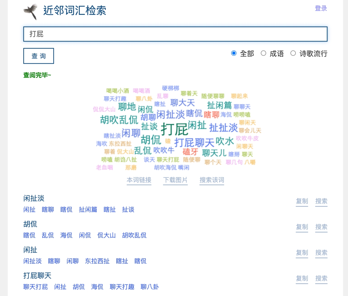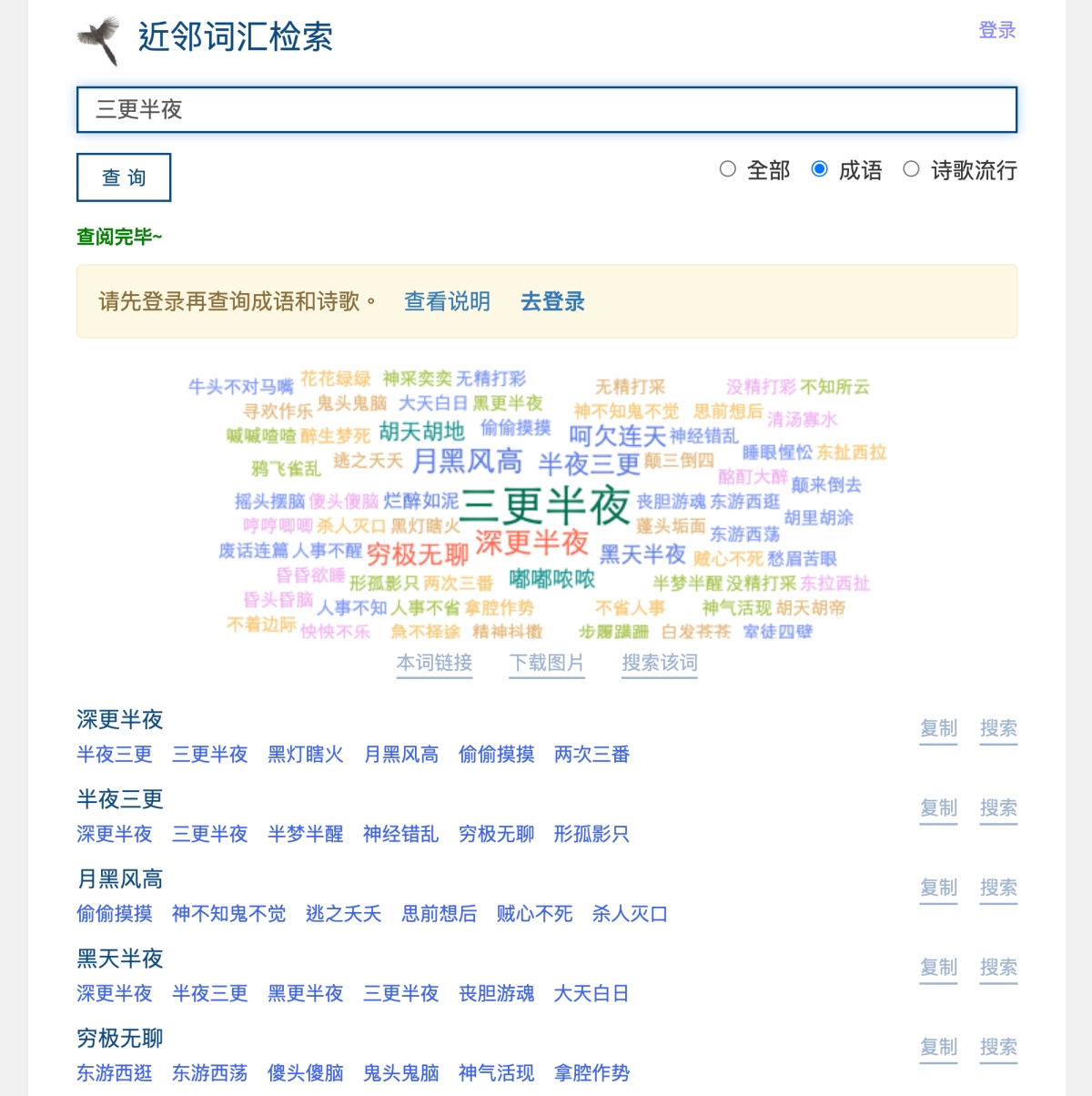 網站:https://tool.mingdawoo.com/lang/nearby_word/進入網站後,直接在搜尋框輸入想要搜尋的字詞就可以了。