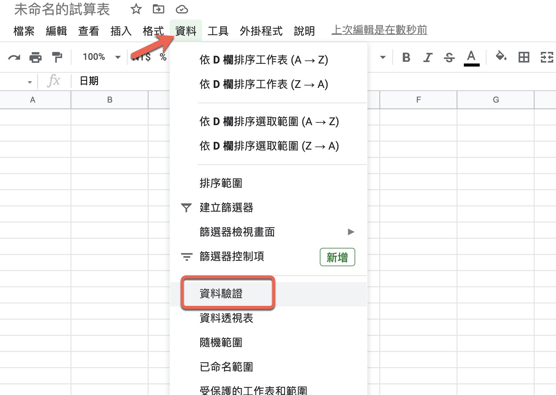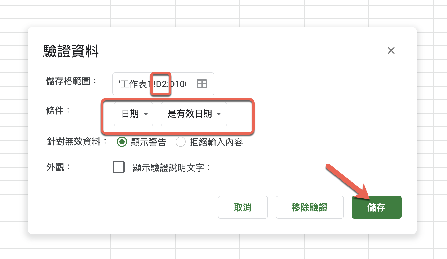 然後將儲存格範圍的第一個改成第二欄,比如我選的是 D,那就是把 D1 改 D2,因為第一欄已經是標題列了,接下來條件選擇「日期」,後面是「有效日期」,按下儲存就搞定了。