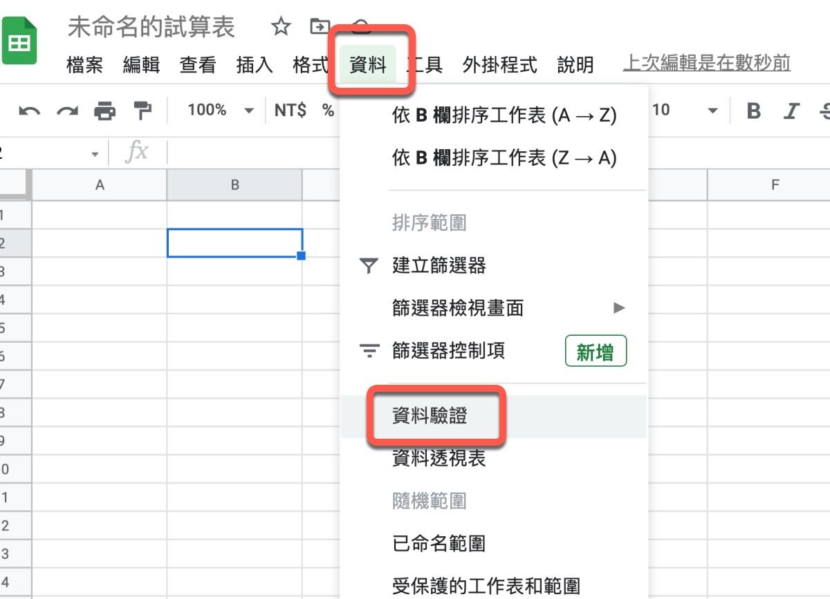 選擇要建立下拉式選單的欄位後(可以一次選擇多個範圍,如果你這個範圍都是同樣的下拉資料的話),然後選擇上面的「資料」>「資料驗證」。
