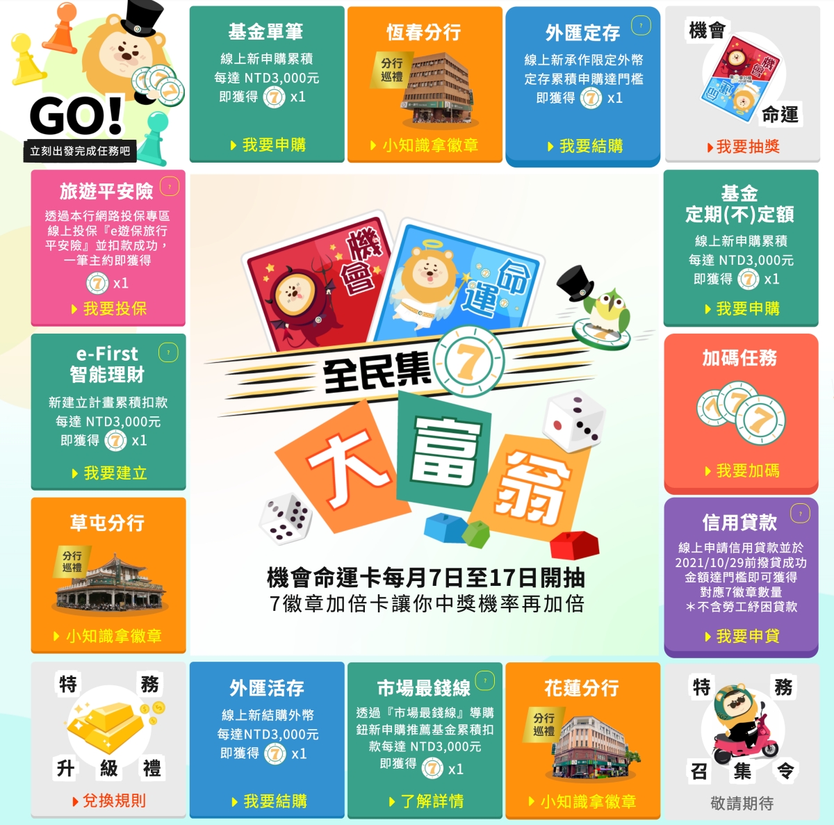 - 智能理財加碼: 2021/06/30 前(含)無智能理財下單記錄者或無餘額者承作智能理財,加贈七徽章 1 枚。