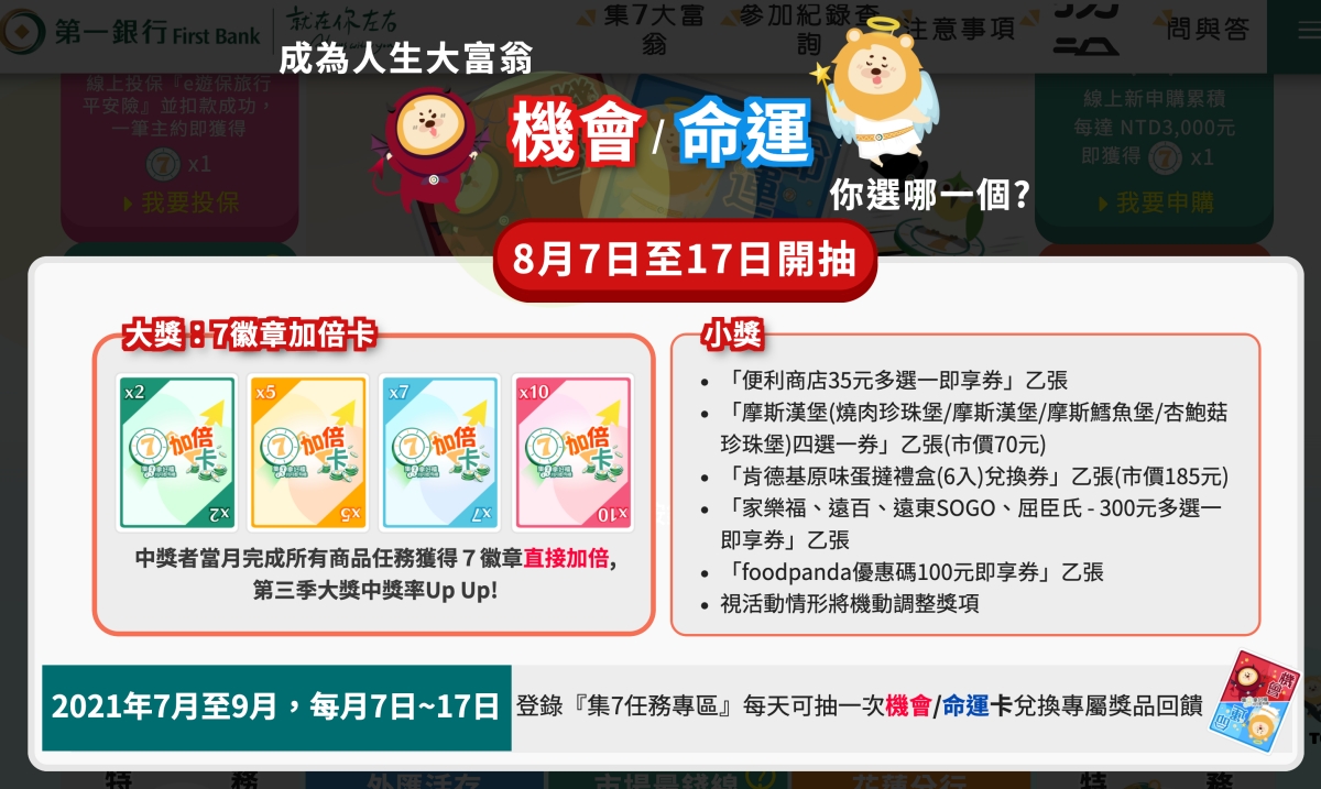 活動還有八月及九月,這二個月的 7~17 日,每天只要到活動網頁按下機會/命運就可以抽獎,每天都可以抽一次,最大獎可以獲得當月七徽章加倍,小獎也有各種美食、百貨優惠兌換券,可以別忘了設定行事曆提醒自己讓七徽章加倍的時間到了!