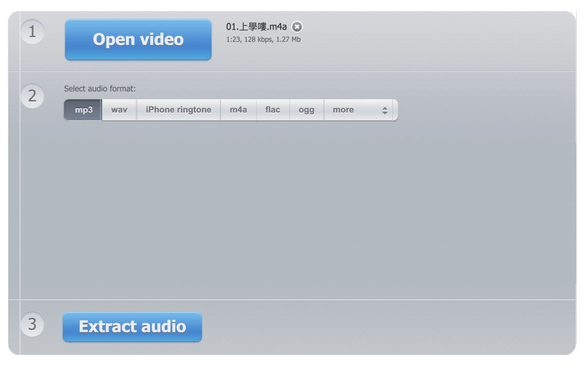 網站:https://audio-extractor.net/進入網站後點擊 Open Video 然後選擇要轉檔的檔案,可以是影片檔也可以是音樂檔。