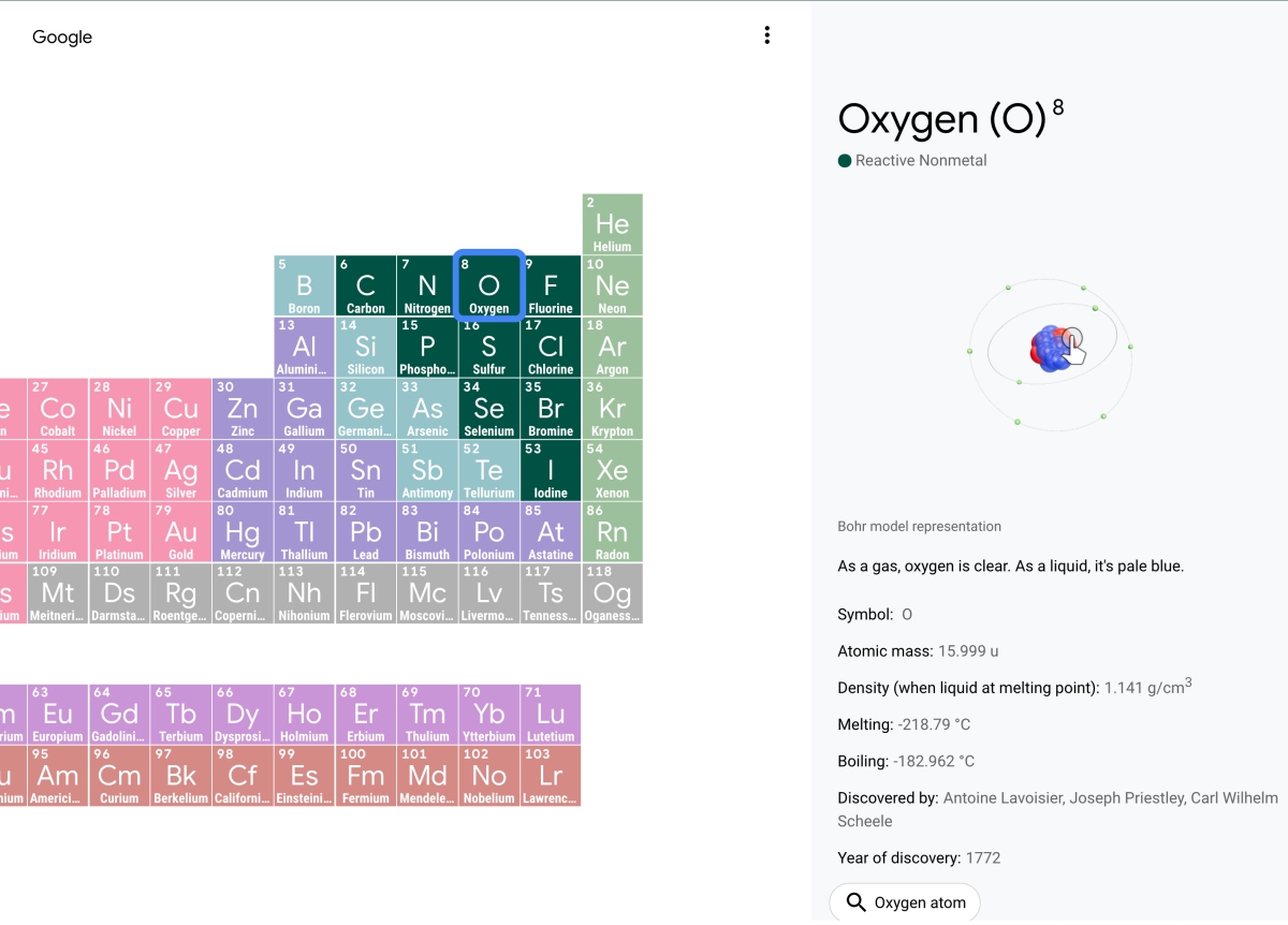 比如點擊 O 氧氣,右邊就會出現他的結構 3D 圖還有相關的說明了,有些說明可能還會有趣點,以氧氣來說就比較中規中矩,翻成中文大概是「氣體狀態下是透明的,液態氧的話會是淡藍色的」。
