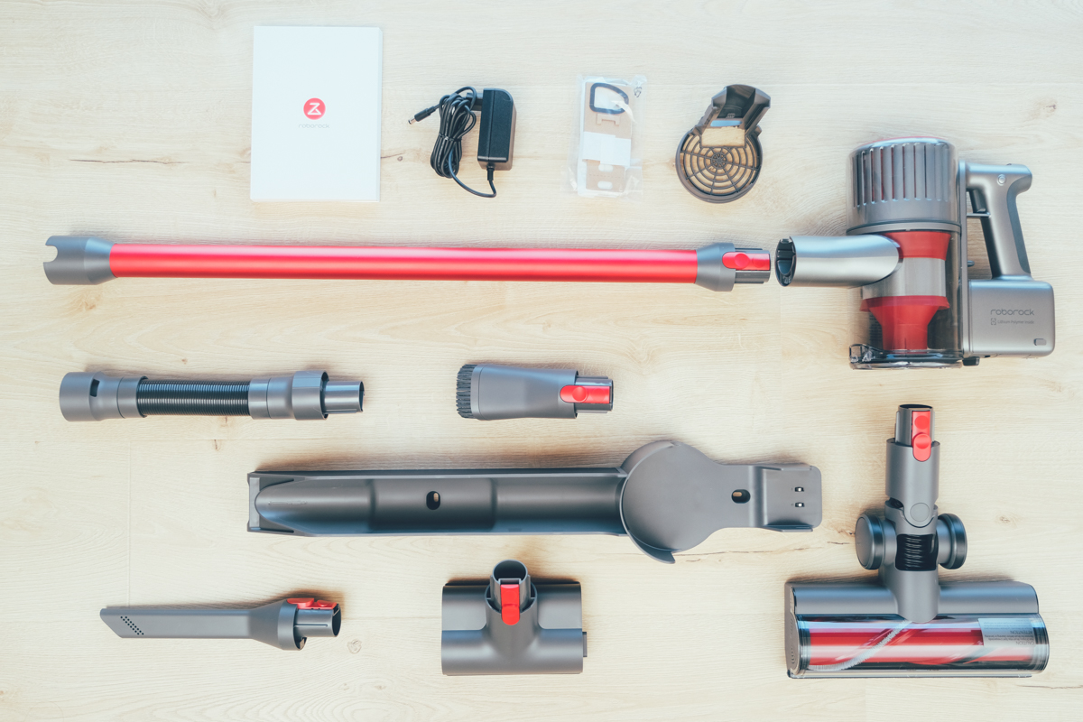 我們先來看看這次的 H7 的配件包括有哪些,除了 H7 主角本人之外,配件包括有金屬連接桿、地板地毯兩用刷、除塵蟎吸頭、延長軟管、長扁吸頭、短毛吸頭及壁掛式磁吸充電座(包括電源變壓器)、集塵袋支架以及集塵袋。