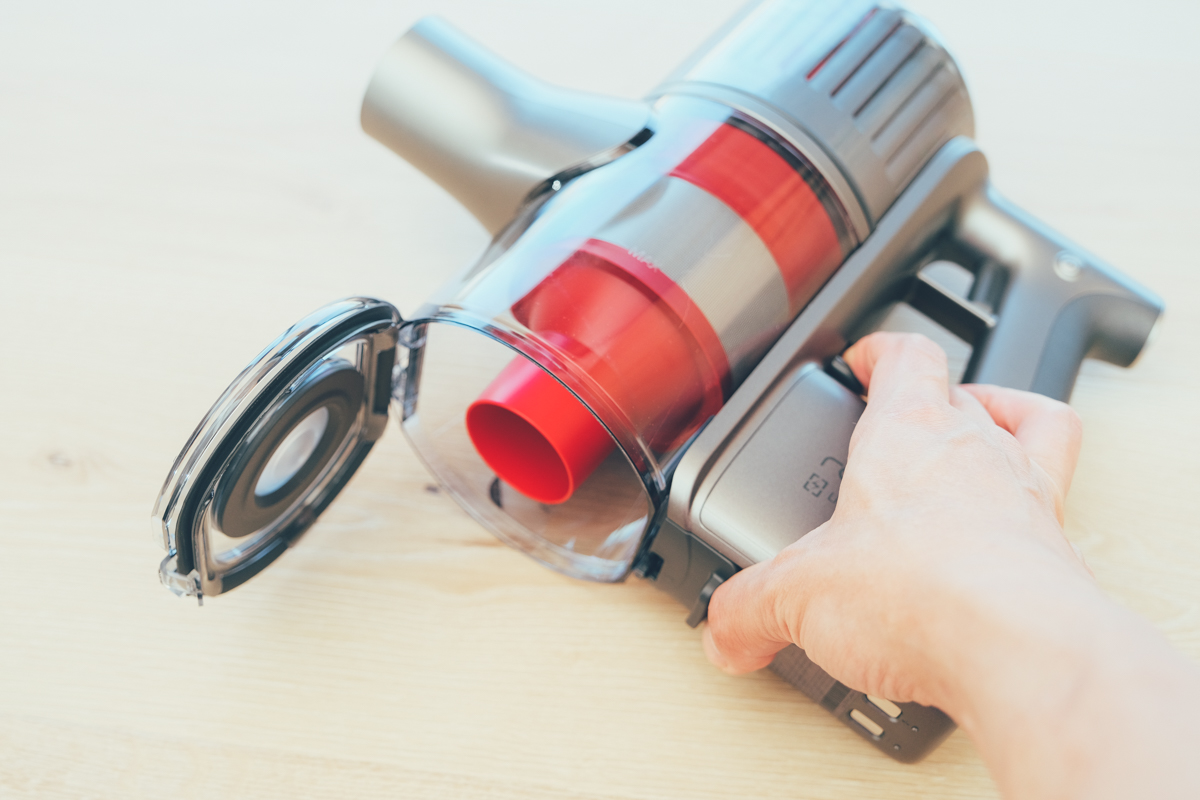 在板機的下方按一下就可以彈開集塵蓋將垃圾傾倒出來,不用自己沾手,也更好將垃圾往下清空倒入垃圾桶。