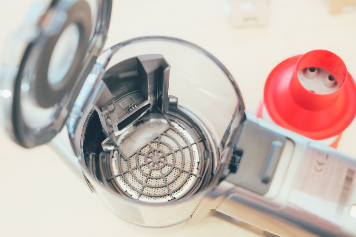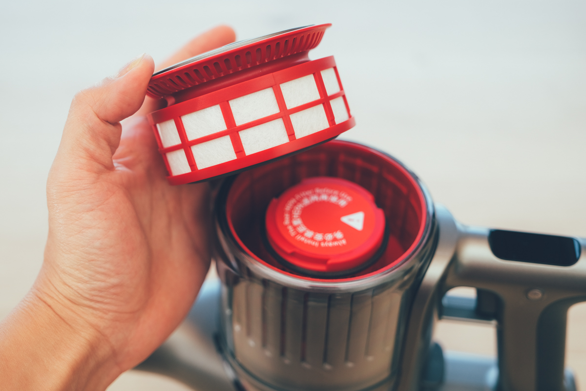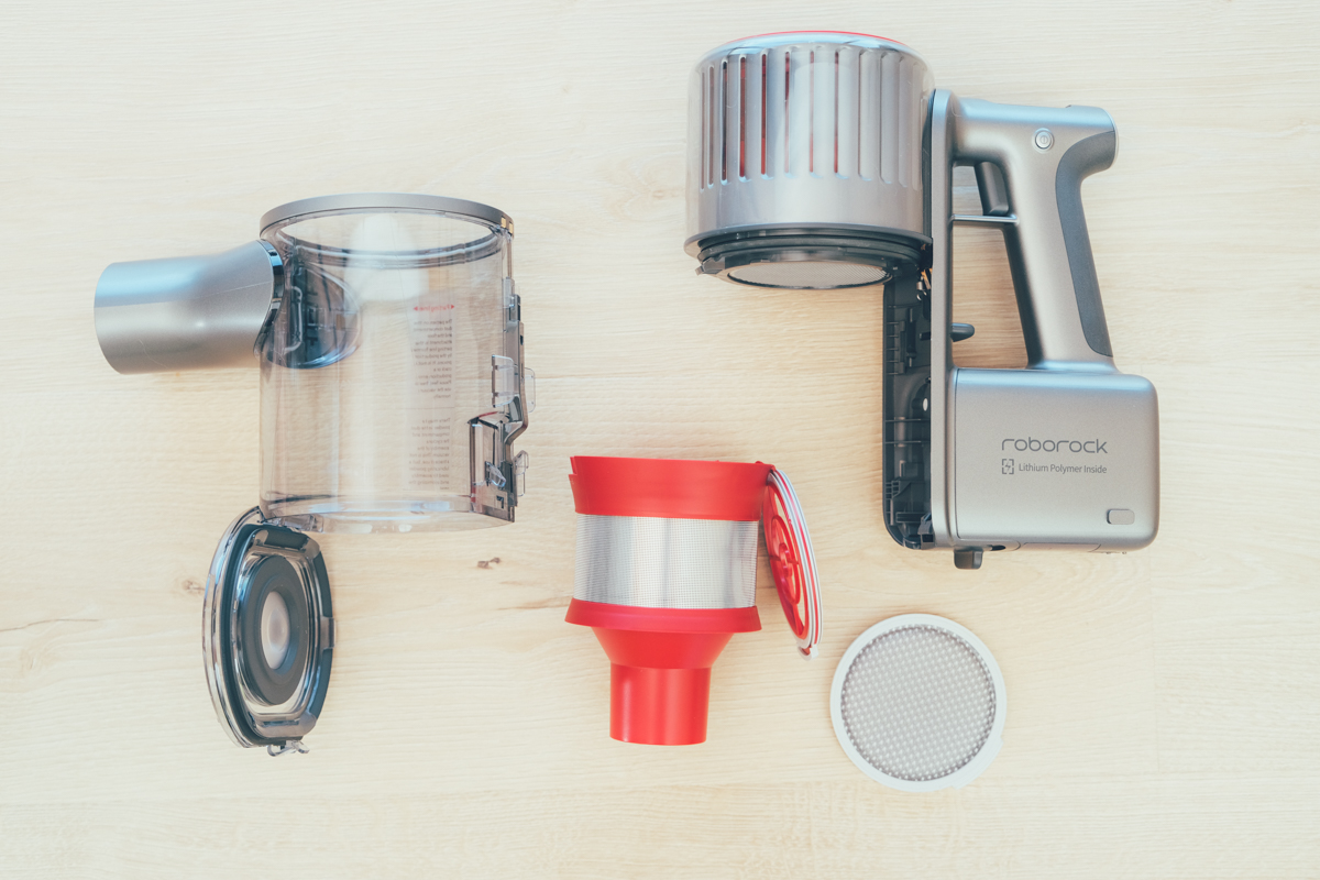 阿湯有另一個很喜歡的設計,就是集塵桶是可以「很輕鬆」的全部拆卸,包括不鏽鋼濾網、高密度棉濾網,有些吸塵器的前方集塵桶雖然可以拆卸,不過有些設計的很難拆,一不小心可能還會弄壞零件,但石頭科技的設計真很方便。