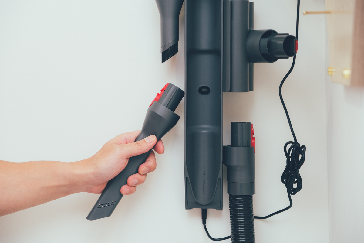 平常放回去就像這樣,直接靠上去就吸住了,真的有夠方便,因為這樣的設計,你也可以將吸頭吸附在任何的金屬面上,比如像是冰箱,這樣可以收納的地方就更加的廣泛,不再只是侷限在收納架上,甚至你可以在想要放置的位置黏上鐵片,同樣可以用來收納吸頭。