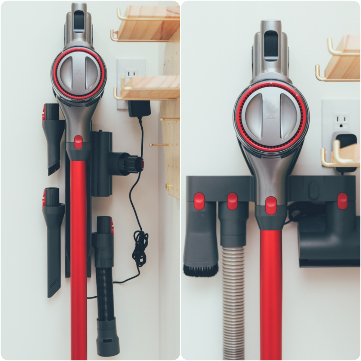 再來就是重點中的重點了,H7 這次最棒的設計就是收納架的部份,下方右圖是 H6 原本的設計,可以將各種吸頭直接插上去收納,分成左右二側,其實這樣的設計阿湯已經覺得超方便,但沒想到 H7 居然直接改成了磁吸設計(左圖),在收納架的二側加入了金屬材質,吸頭上則加上磁鐵,直接就可以吸附上去收納,這樣的設計也讓拿取變的更加方便。