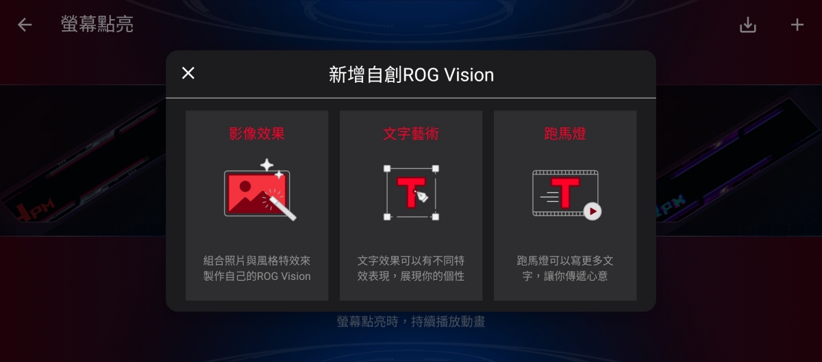 你也可以利用 ROG Vision 來自訂內容,還可以用成跑馬燈,其實這真的是相當實用的功能啊,演唱會就可以用了。
