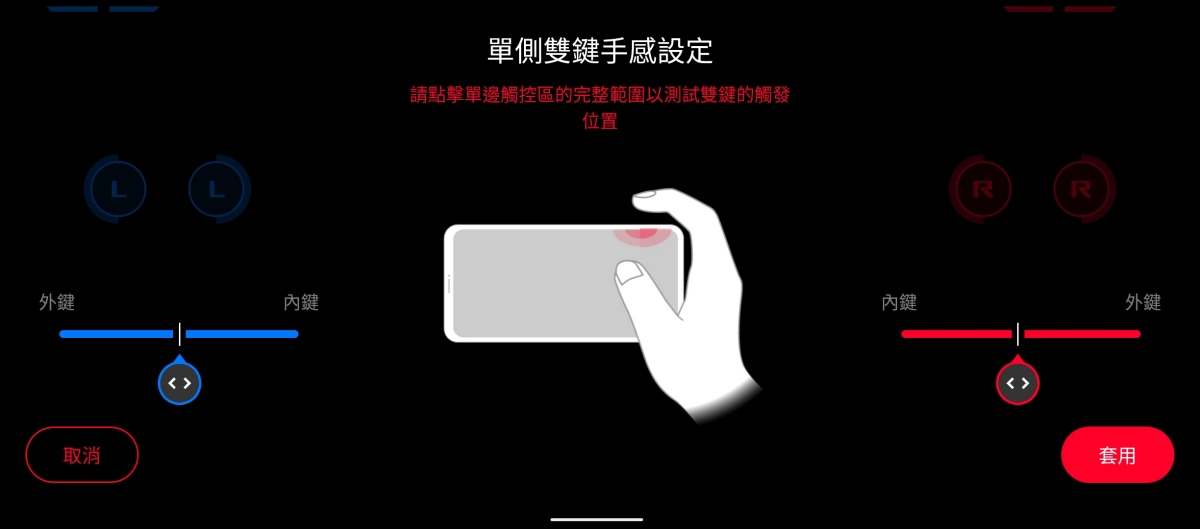 針對遊戲相關的設定,也能再進一步的設定觸發速度、按鍵的手感,更特別的是還有滑動手感的設定,所以單這個超音波觸控鍵就有相當多元的操作方式,再加上 ROG Phone 5s Pro 還有專屬的後置觸控鍵及風扇實體專用鍵,操作方式真的相當多元。