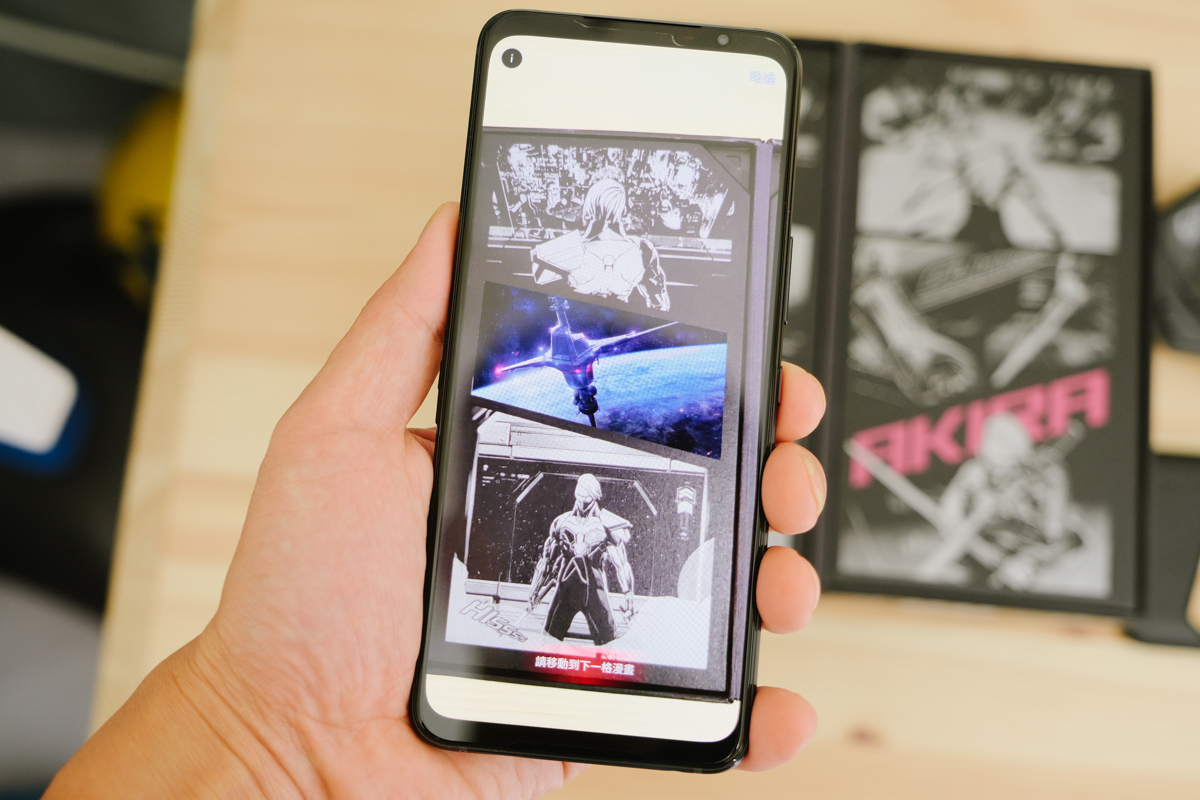 而六角盒上的 AKIRA 漫畫,原本是黑白的,在開機時只要用 ROG Phone 5s Pro 跟著步驟掃描畫面,每一格都會出現彩色動畫,非常的酷。