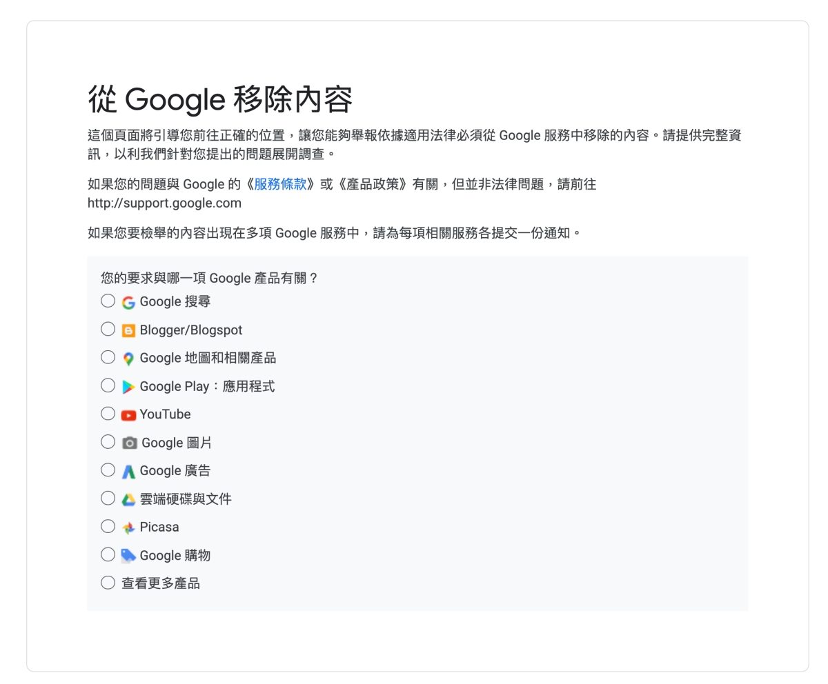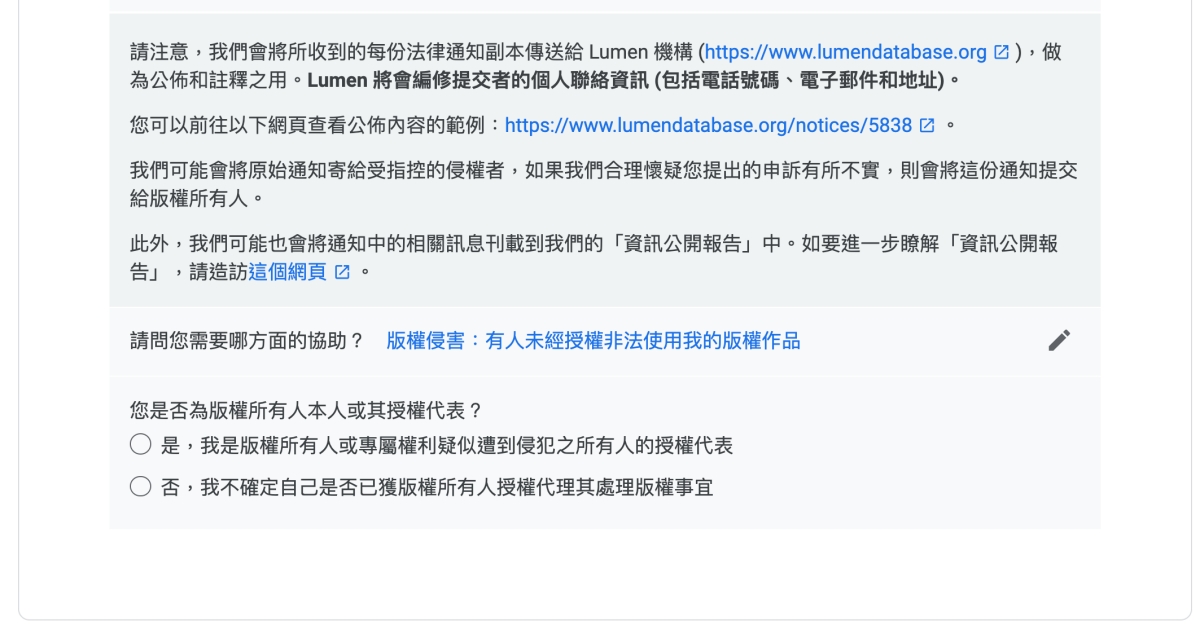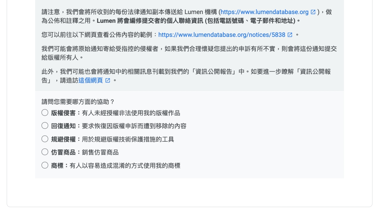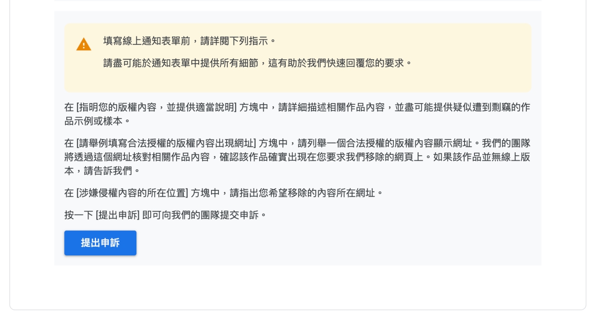 網址:https://support.google.com/legal/troubleshooter/1114905?hl=zh-Hant