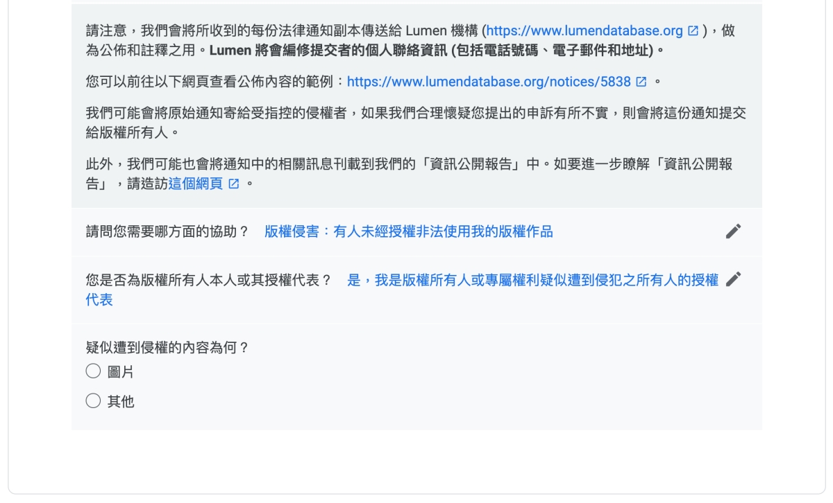 然後填寫相關資料以及描述侵權的行為,最後送出後就可以等待 Google 處理回報了,但如果你的內容或圖片是在台灣被盜用,且明確的知道對方是誰,可以先私下和解,如果對方不願處理或理賠,那麼就搜證後向保智提出申訴吧。