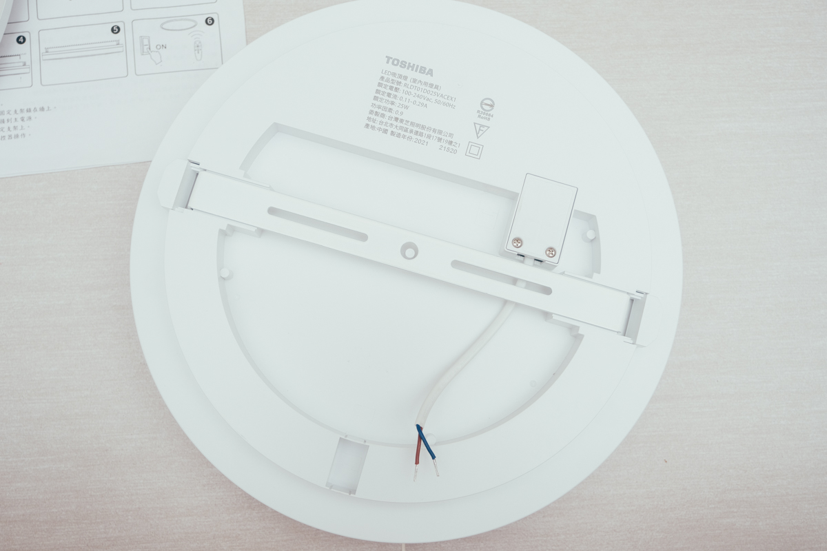 盒裝內附一組 TOSHIBA 和日LED吸頂燈、一組遙控器、一份安裝/使用說明以及一組安裝用螺絲組,TOSHIBA 和日LED吸頂燈外形非常簡潔,阿湯個人是喜歡這樣清爽的設計,像有些吸頂燈就會設計的很浮誇,但華而不實,還不如回歸本質先把燈源弄好吧....