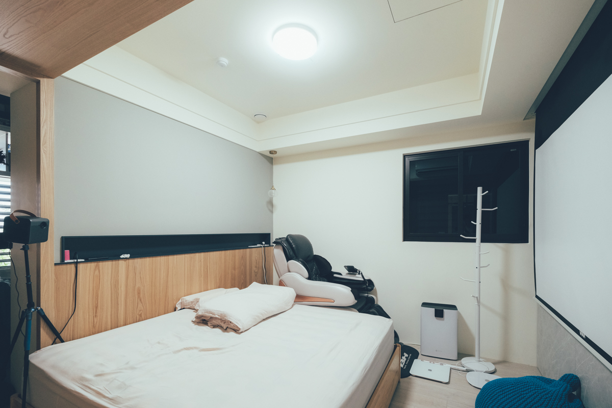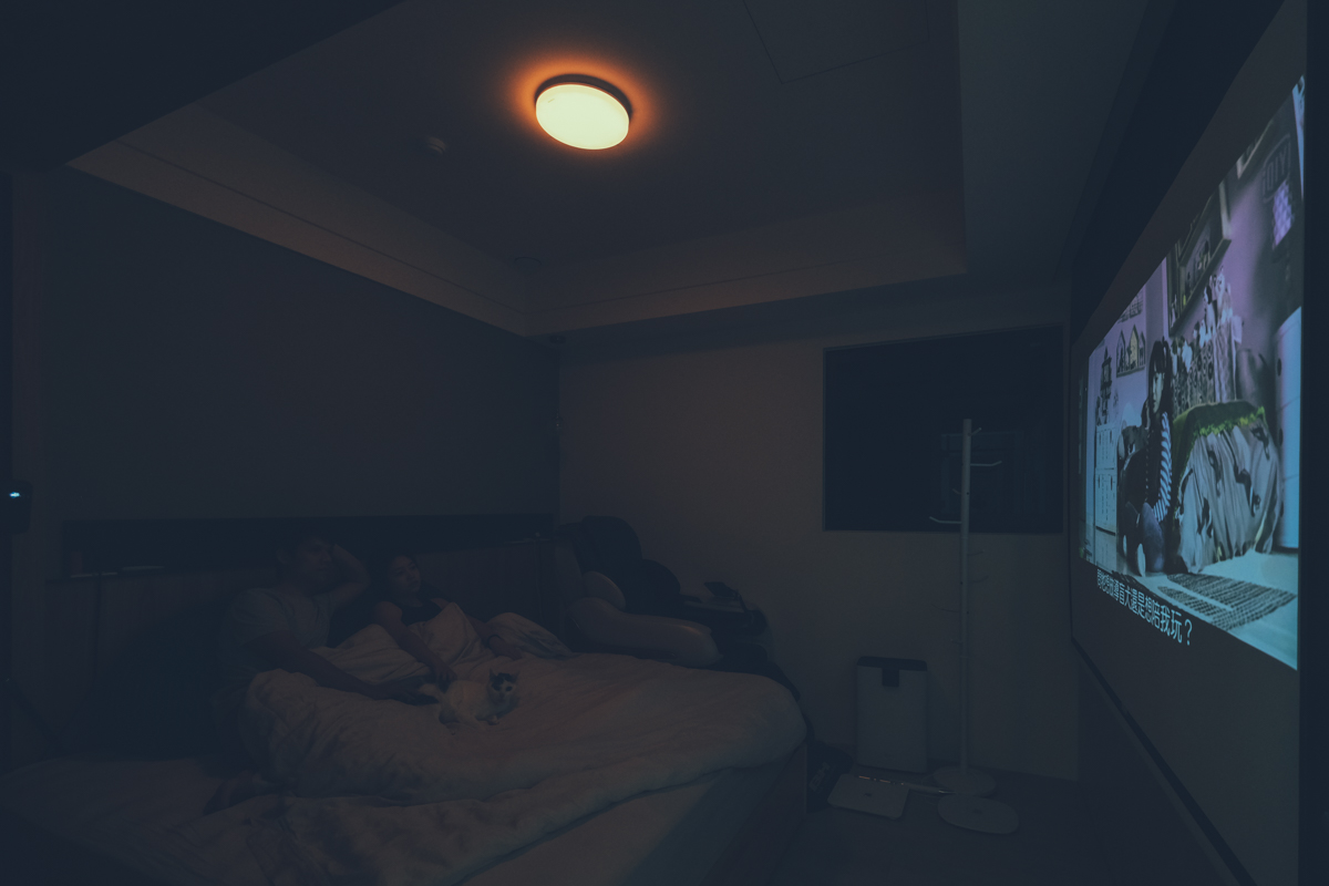 睡前大概 1 小時左右我們會開啟家庭劇院模式,打開投影機,不過之前因為沒有夜燈,只能全關燈,而現在搭配 TOSHIBA 和日LED吸頂燈可以開啟最低亮度的夜燈模式來看投影機,可以讓房內有基本的亮度同時不影響投影機的光源。