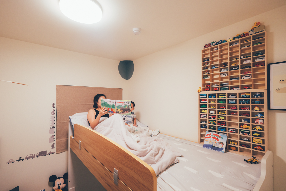 而湯包的房間除了有明亮的環境讓他在裡面盡情玩耍外,現在快要三歲的他也超愛聽故事,每天睡前沒有唸個十本書給他聽是不會放過我們的,而在睡前為了要培養睡覺的氛圍,我們也會先將燈光切換成暖黃光,陪他看書,等看完後,躺下就可以直接用遙控器關燈,一早起床相對的,也可以先開成暖黃光後再慢慢調亮,除了讓湯包隨著燈光慢慢醒來,也讓我們自己可以喚醒大腦,迎接新的一天。
