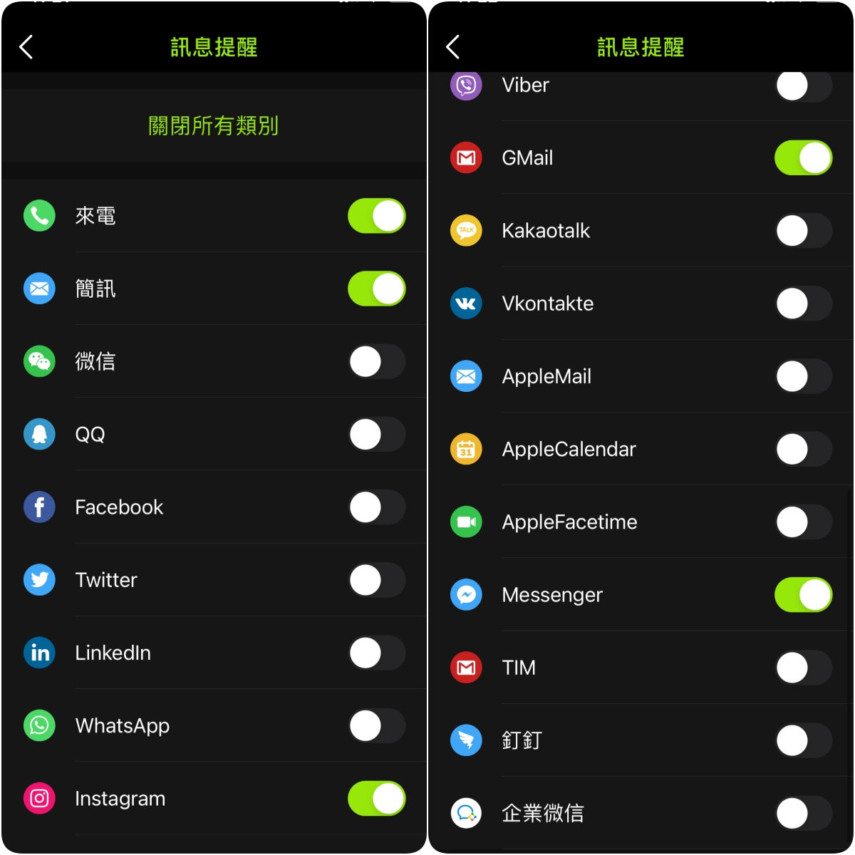 訊息提醒的部份,雖然是有限定的 APP,不過我們比較需要在手錶上跳出提醒的項目包括電話、簡訊、Gmail、微信、LINE、FB Messenger、IG 等,都有支援,可以依自己需要的通知項目選擇開啟就好,阿湯也蠻喜歡這樣可以各別設定的功能。