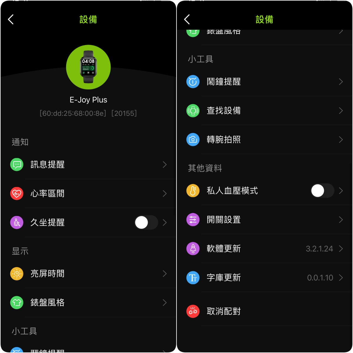 其它功能還有久坐提醒、鬧鐘、找手錶(按了手錶會震動),透過手錶轉動啟動手機快門,基本手錶需要的功能都有了。