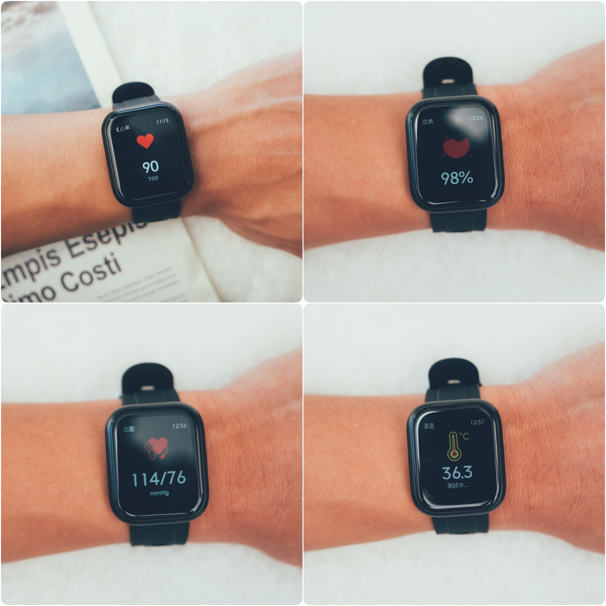 背面的感測器支援量測身體四大重點資訊:血壓、血氧、心率、體溫,現在大多是支援血氧、心率,比較少見的是血壓跟體溫,有些有偵測溫度,但主要是針對環境溫度,並非體溫,這是有差異的,在購買時可以注意一下量測的溫度功能是針對什麼。