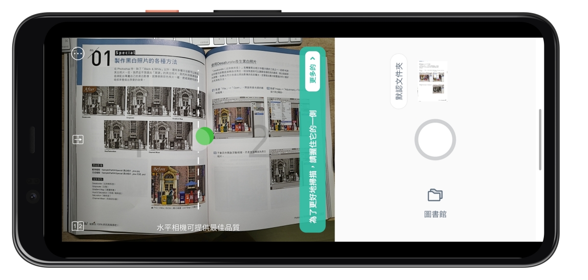 另外,如果切換成雙頁掃描模式,就可以一次對二頁掃描,會給你一個中心點,你只要對在書本中間就好,掃描出來的結果會幫你分成二頁,真的是很方便,快去試看看吧。
