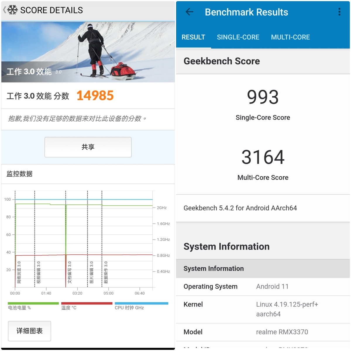 PCMark 工作 3.0 效能分數為 14,985,GeekBench Mark 的分數單核為 993,多核為 3164。