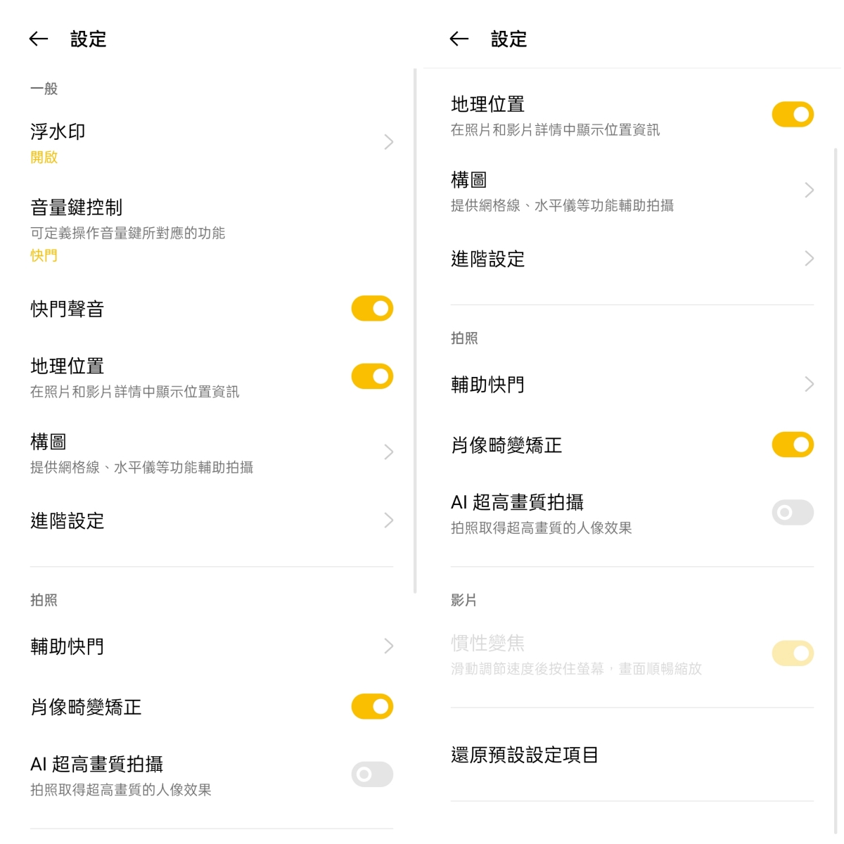 內建的設定也可以額外開啟浮水印、構圖等,還有 AI 超高畫質拍攝功能,保存解析度、畫質更精細的照片(如果有需要時再開就好,不然每張照片都容量超大也不是好事啊)。
