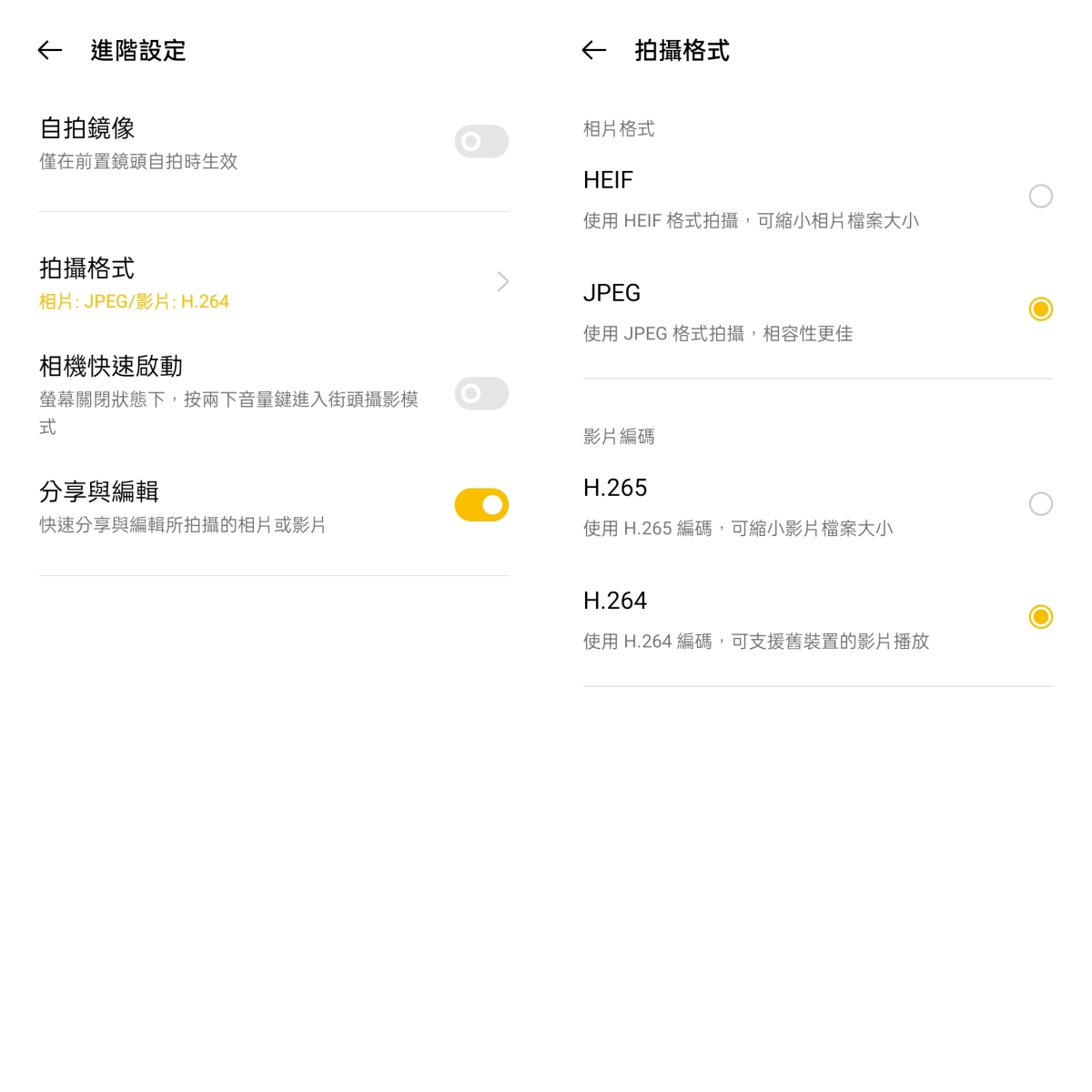 拍攝的格式支援 HEIF、JPG,而錄影的部份支援 H.264 及 H.265。
