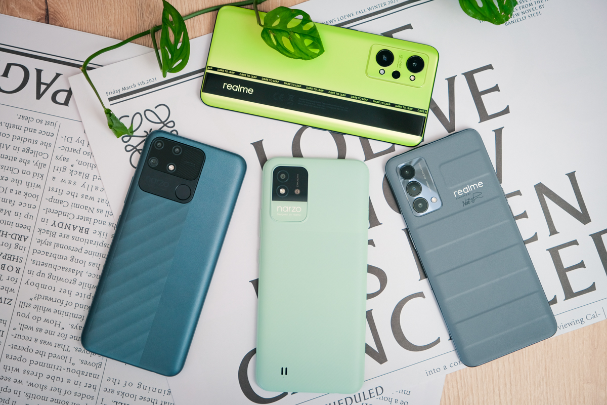 順便同場加映一下,除了 realme GT Neo2 之外,依照不同的需求也可以選擇其它型號,像是想要另一種美型或更好的握手感可以選擇 realme GT 大師版(右下,超美),選擇平價且使用需求沒有那麼高的話,像下面左邊的 realme narzo 50i 及下方中間的 realme narzo 50A 都是不錯的選擇。