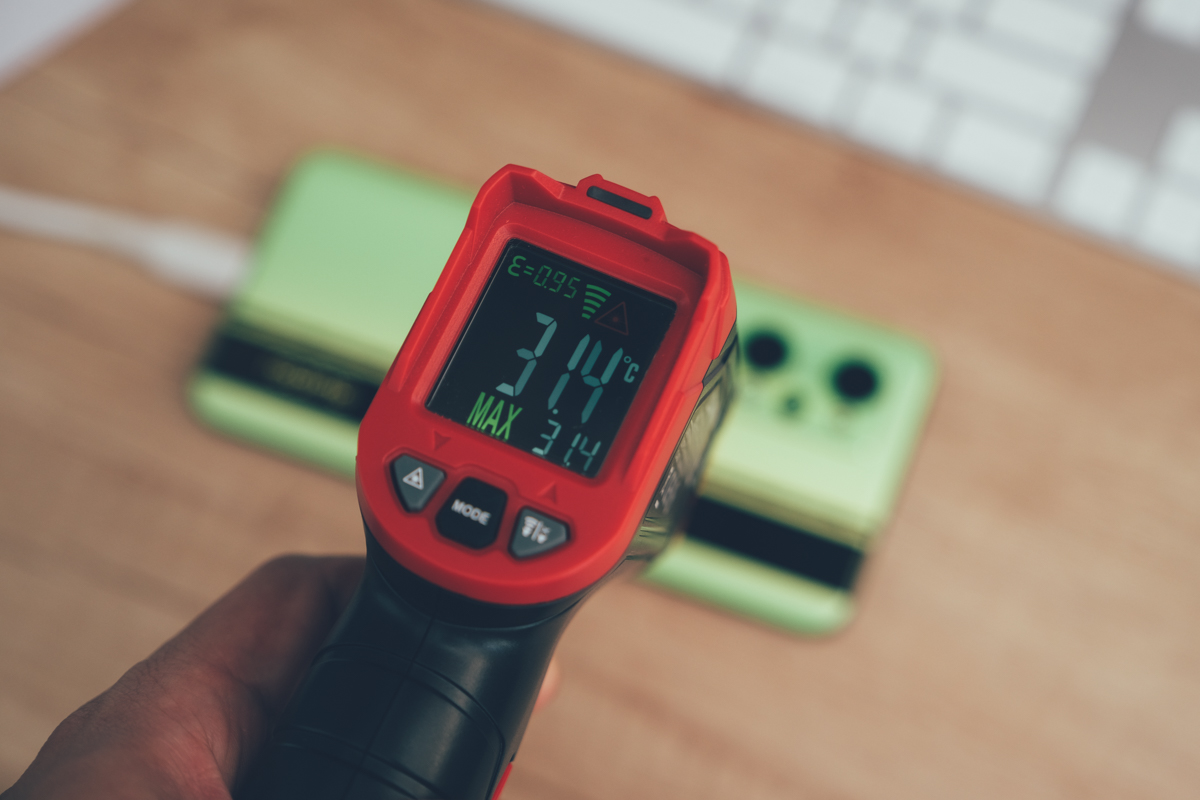 然後直接插著電播放了 Netflix 影片經過 24 小時再測,才從 28.8 度上升到 31.4 度而已,3 度不到,阿湯原本以為感溫槍是不是有問題,實際上用手去觸摸背面,還真的沒感受到什麼溫熱感。事實上阿湯也插電玩原神經過 30 分鐘後測量,溫度其實也沒差多少,感溫槍測試下來也就 32 度左右。